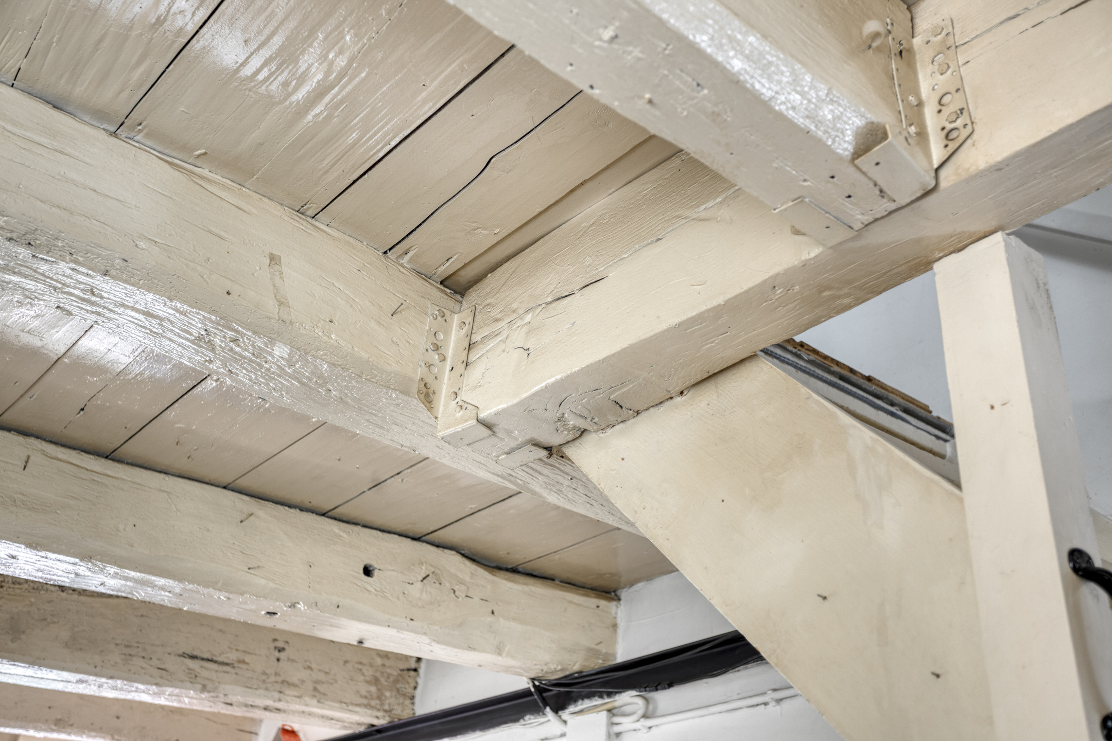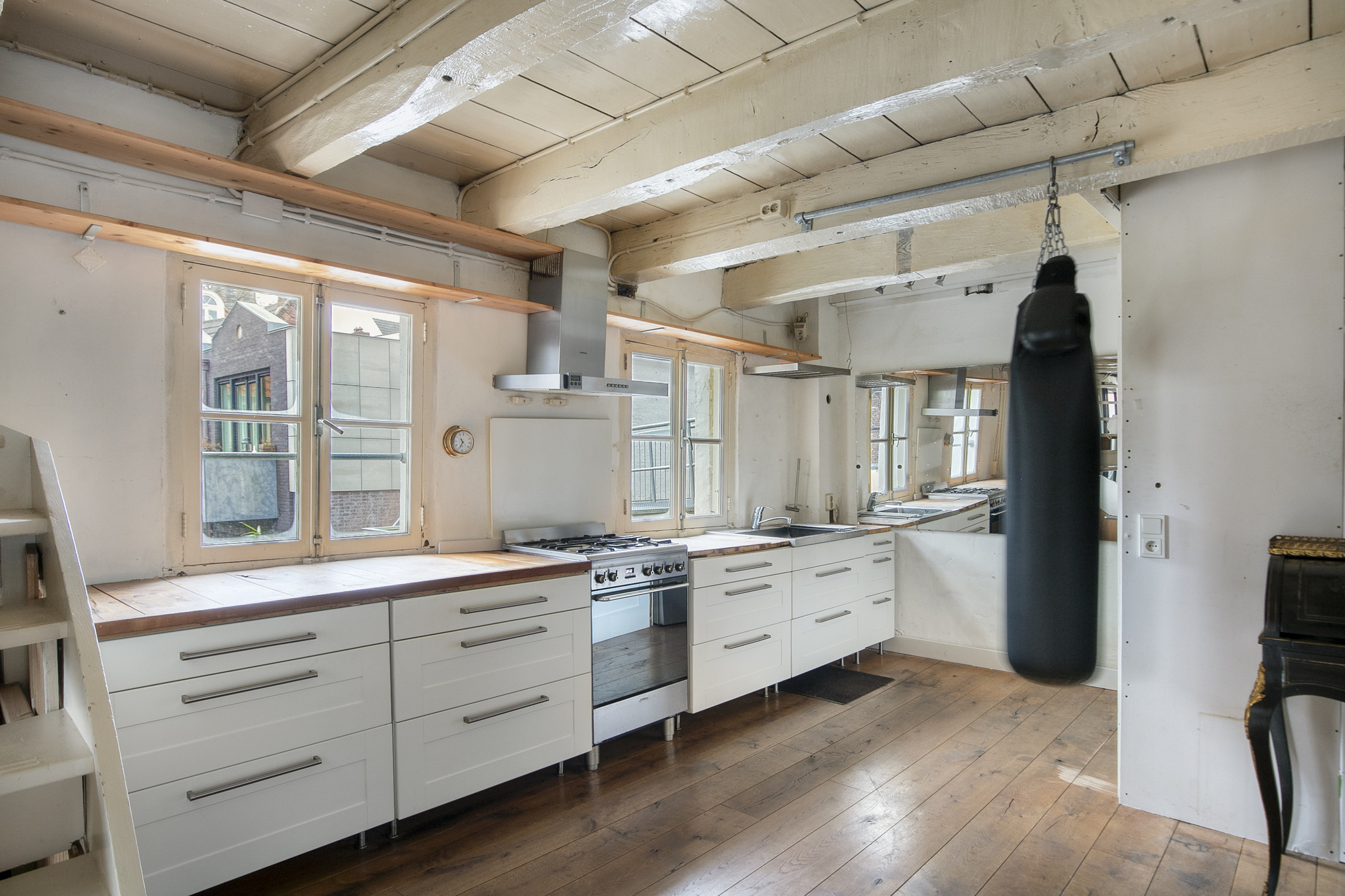 Eerste verdieping: Via een vaste trap bereik je de eerste verdieping, waar de woonkamer en open keuken zich bevinden. Ook hier dragen de houten balken bij aan de authentieke sfeer en zorgen de vele raampartijen voor een fijne lichtinval. De open keuken is voorzien van een wandopstelling met inbouwapparatuur. Deze gehele verdieping is afgewerkt met een robuuste eikenhouten vloer.
