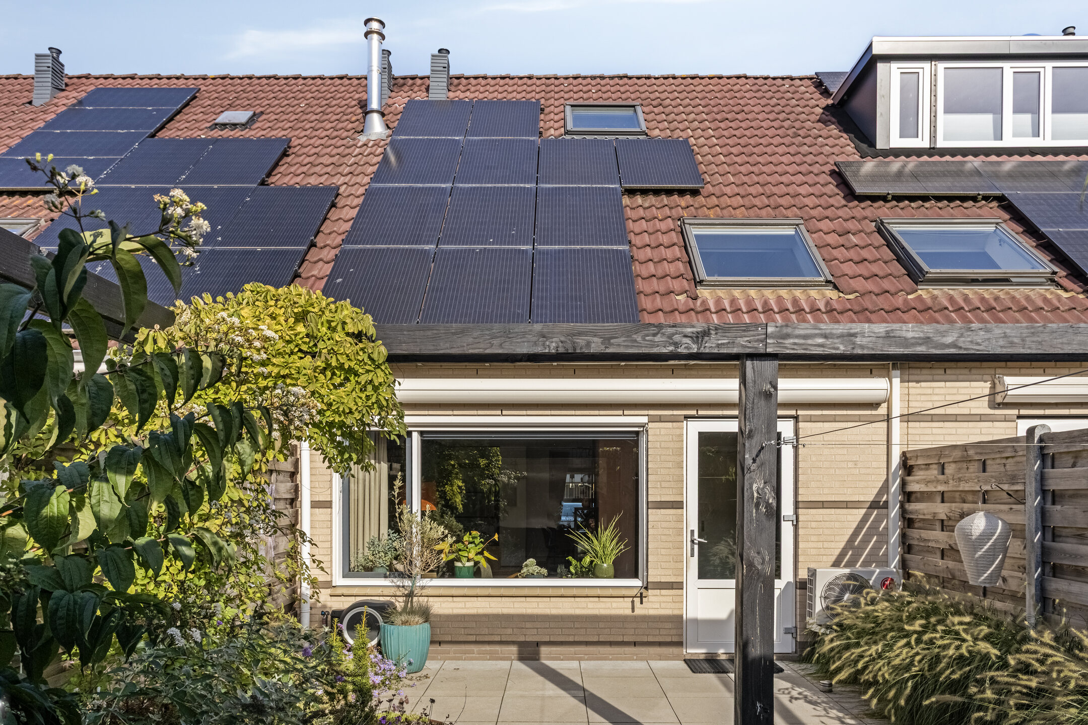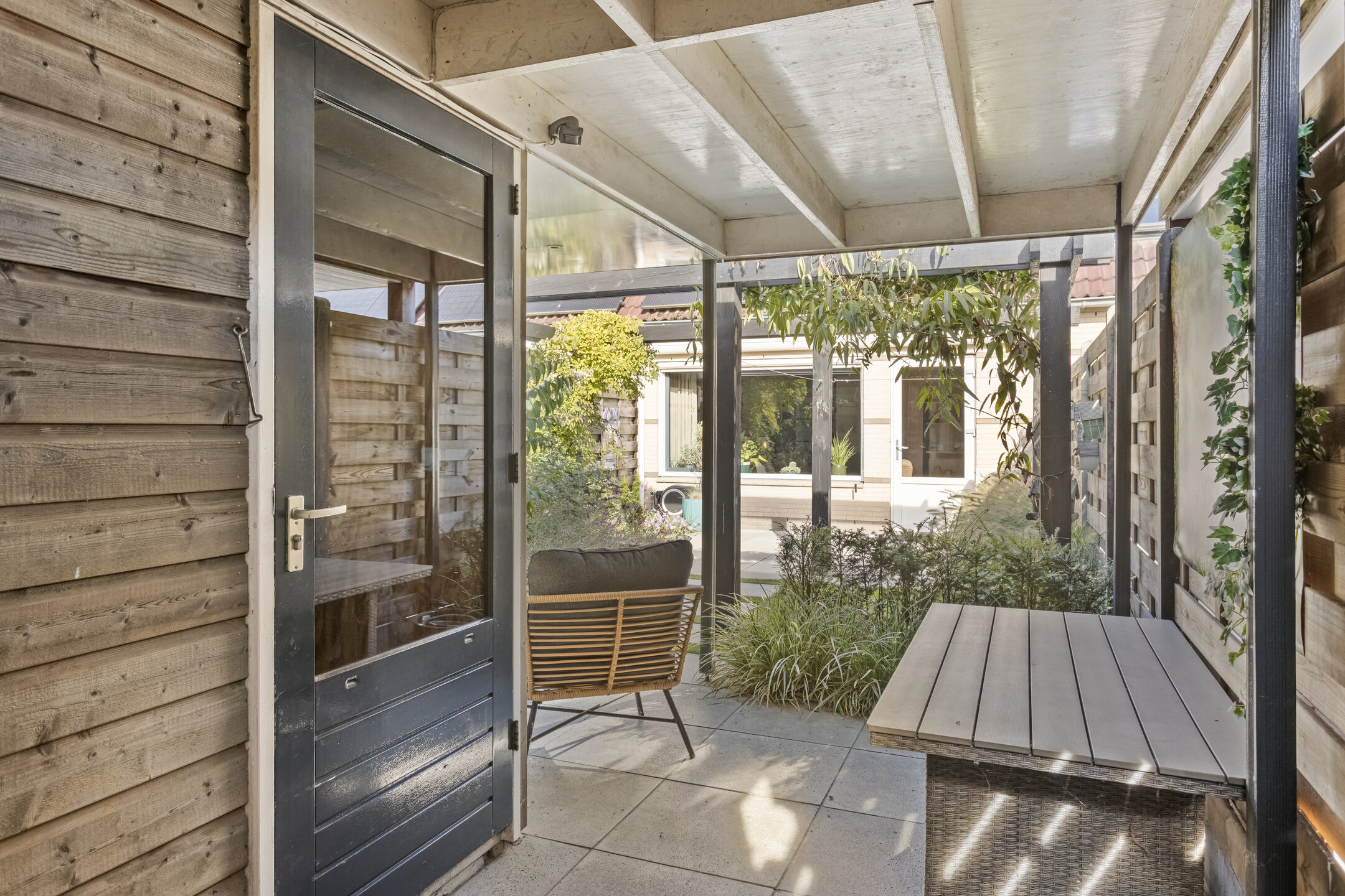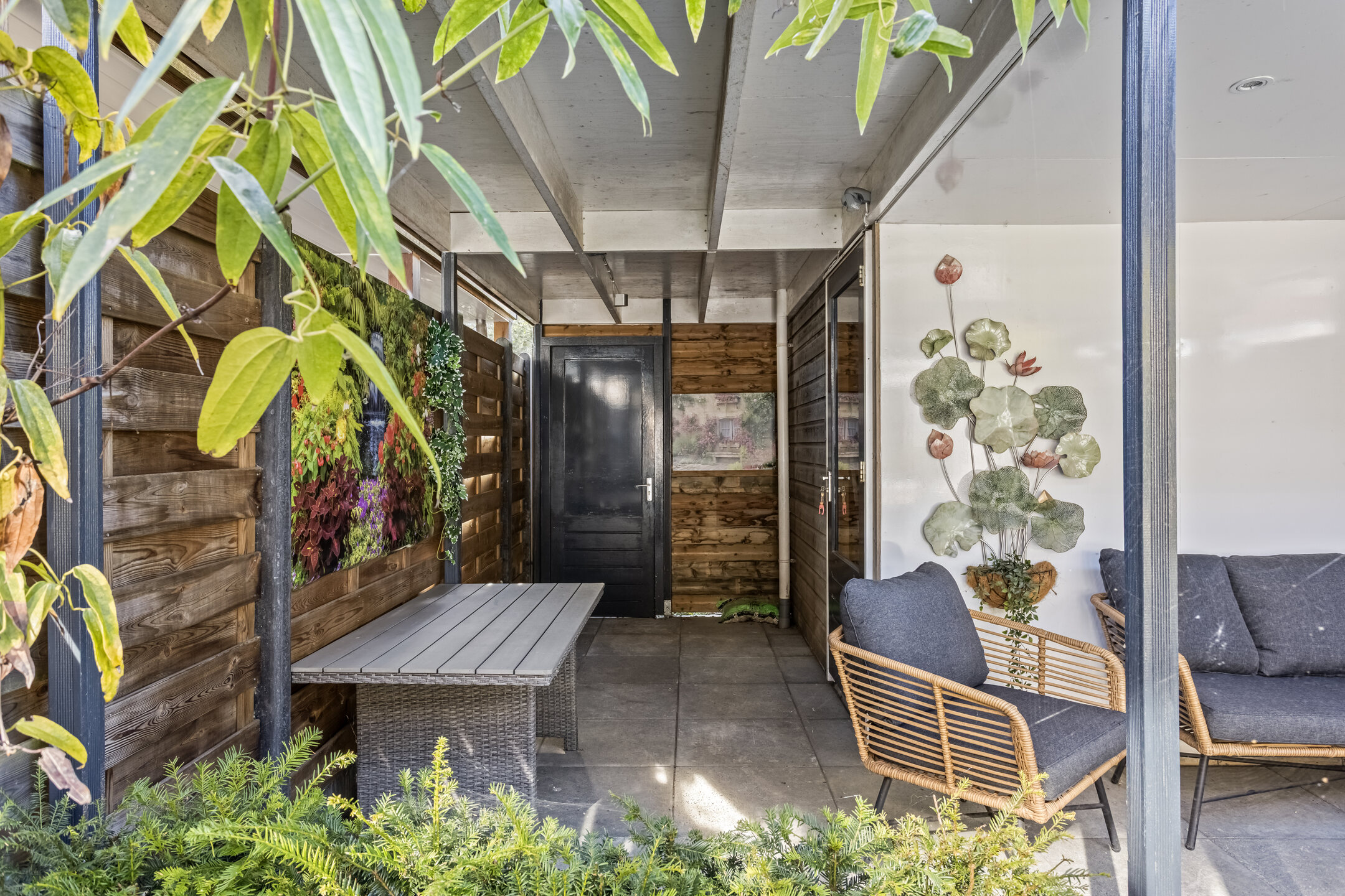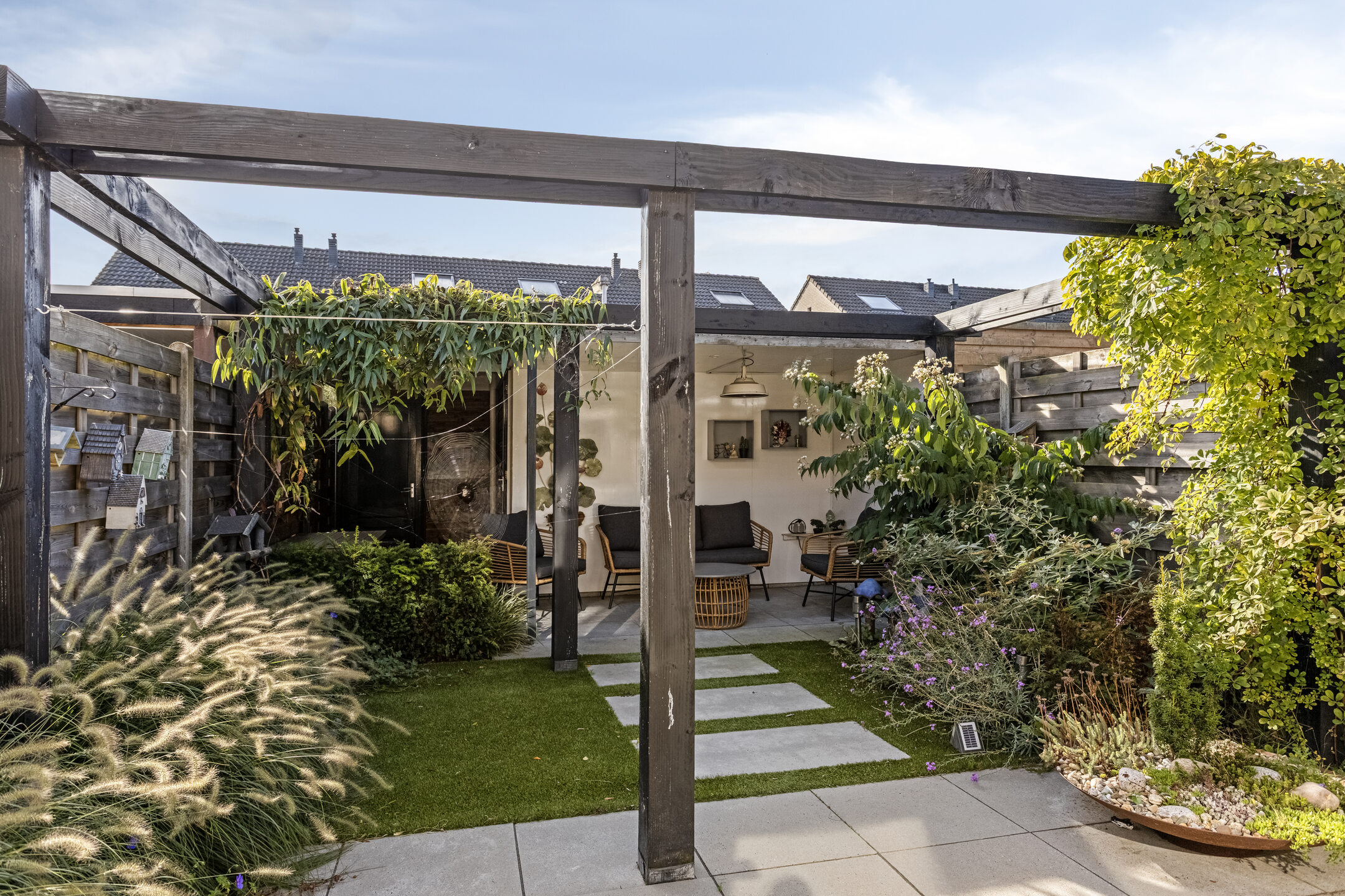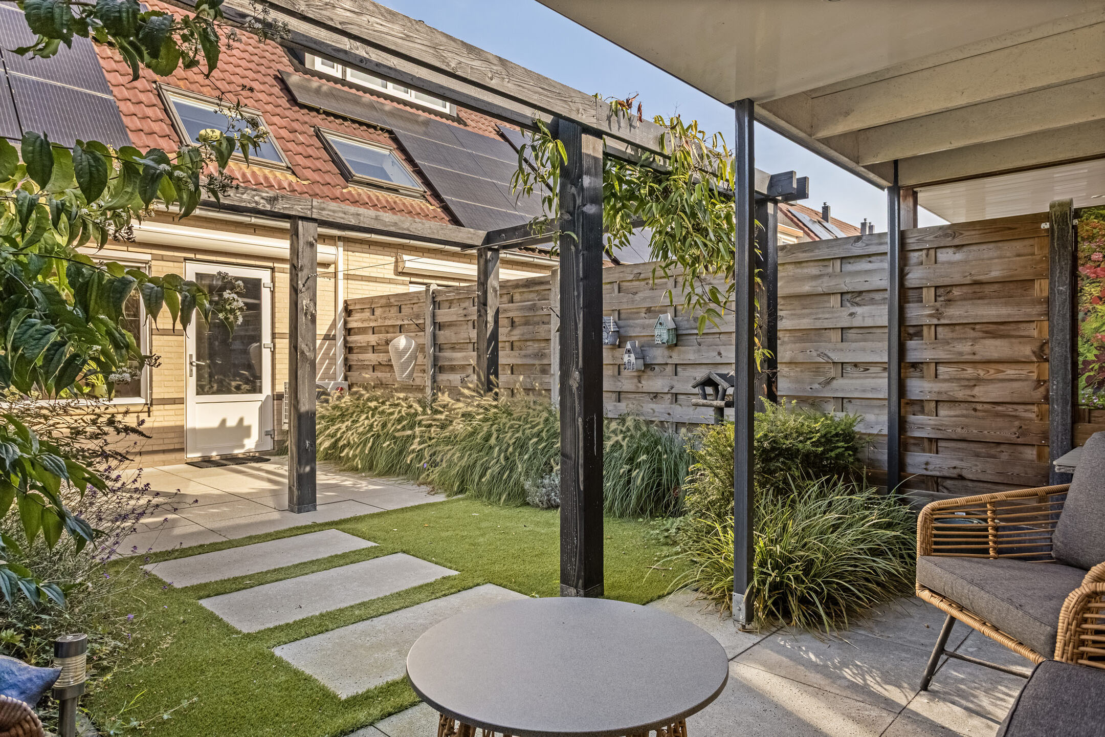Via de achterdeur bereik je de fraai aangelegde achtertuin, voorzien van een prachtige overkapping en twee terrassen. De tuin is gunstig gelegen op het zuiden, waardoor u vrijwel de hele dag van de zon kunt genieten.