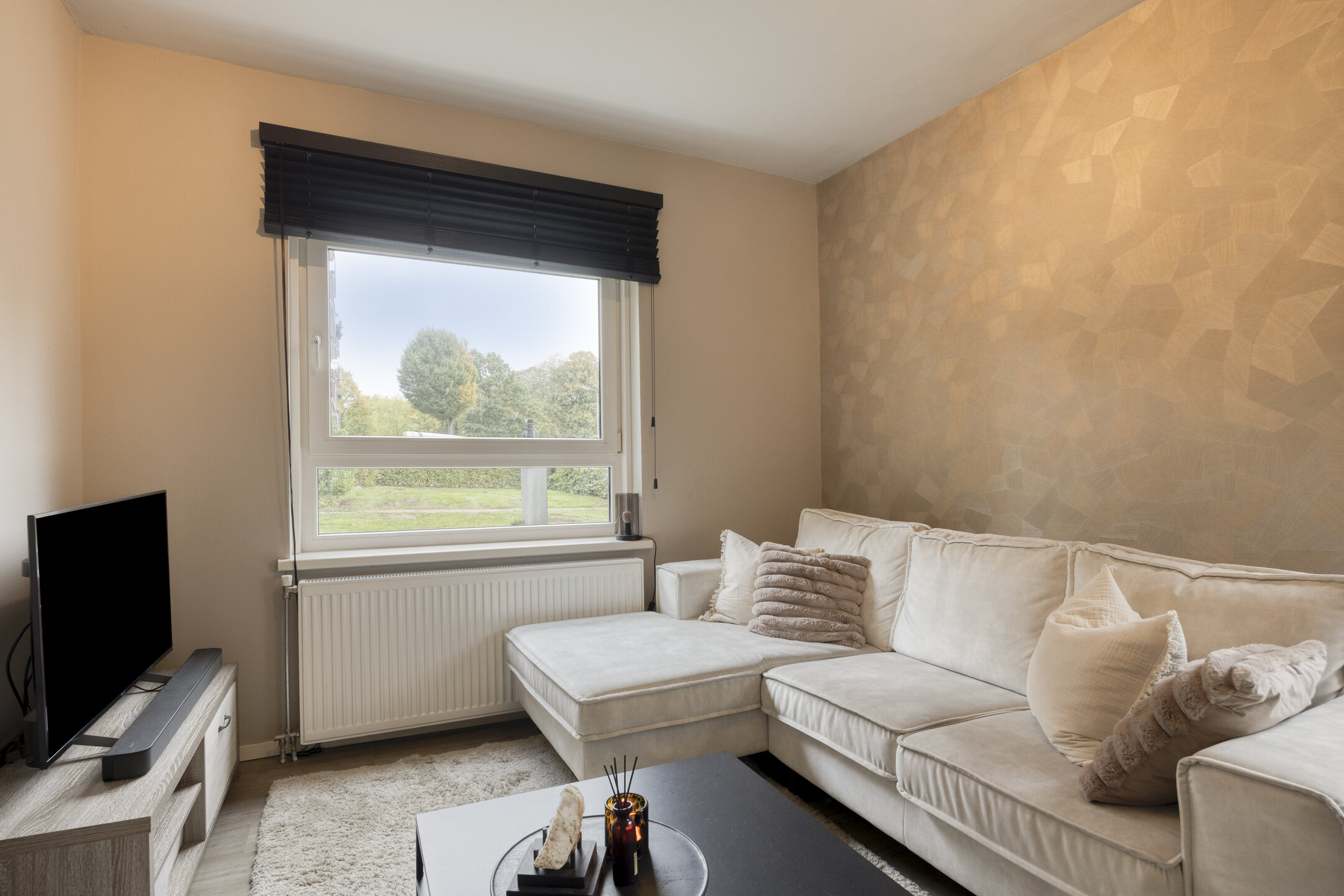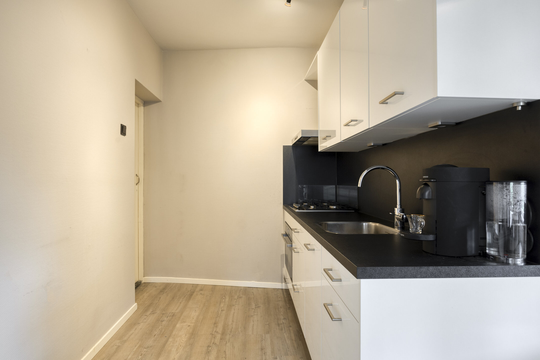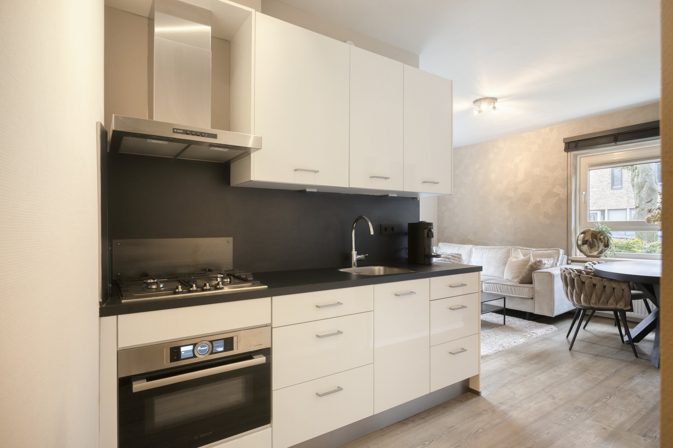 De sfeervolle woonkamer is gesitueerd aan de voorzijde van het appartement en staat in open verbinding met de keuken. Deze moderne keuken is uitgevoerd in een praktische wandopstelling en voorzien van diverse inbouwapparatuur, waaronder een 4-pits gaskookplaat, afzuigkap en een combi-oven.