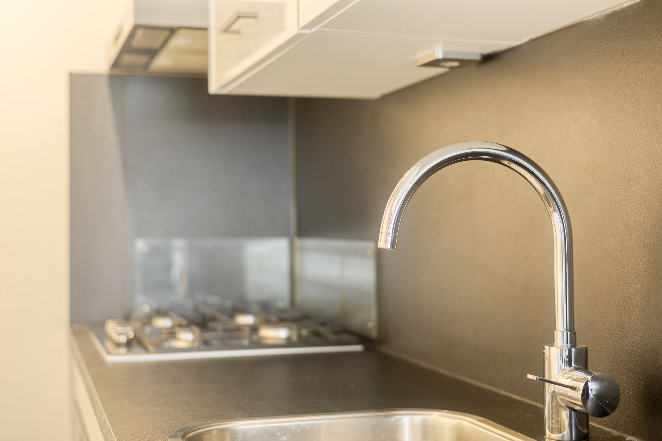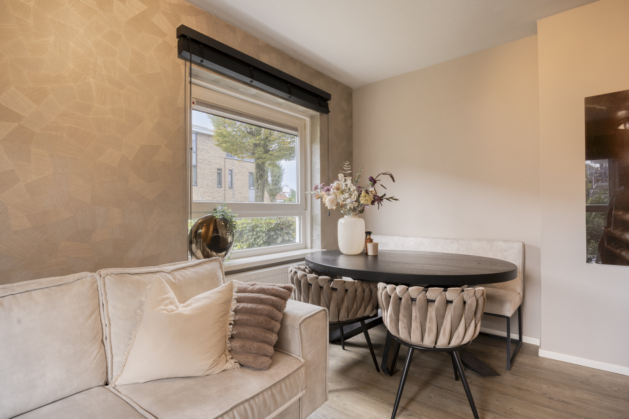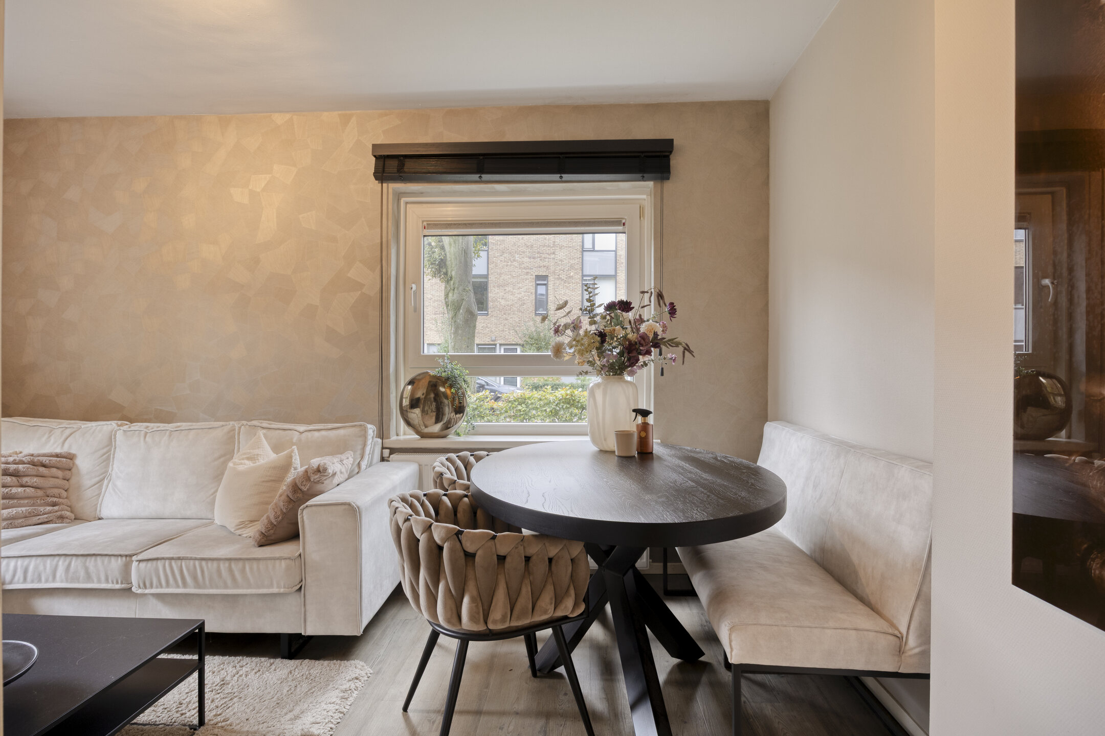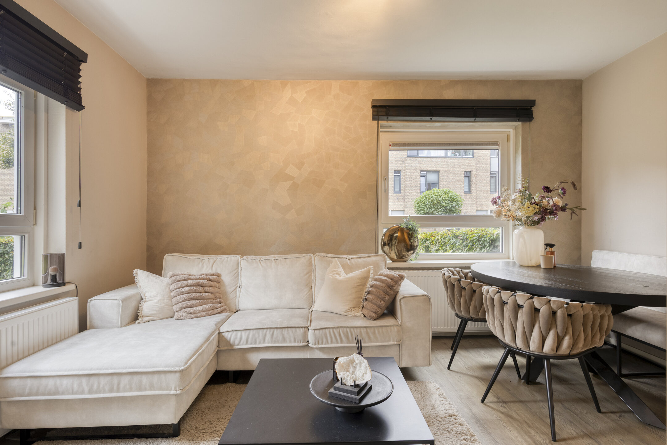 De sfeervolle woonkamer is gesitueerd aan de voorzijde van het appartement en staat in open verbinding met de keuken. Deze moderne keuken is uitgevoerd in een praktische wandopstelling en voorzien van diverse inbouwapparatuur, waaronder een 4-pits gaskookplaat, afzuigkap en een combi-oven.