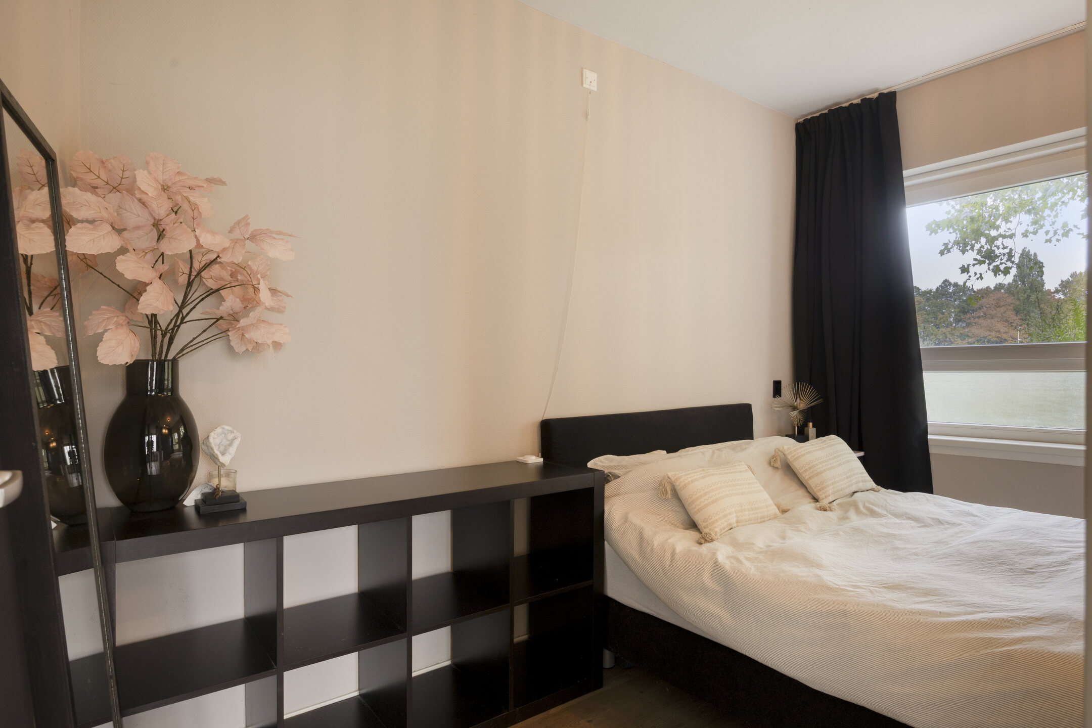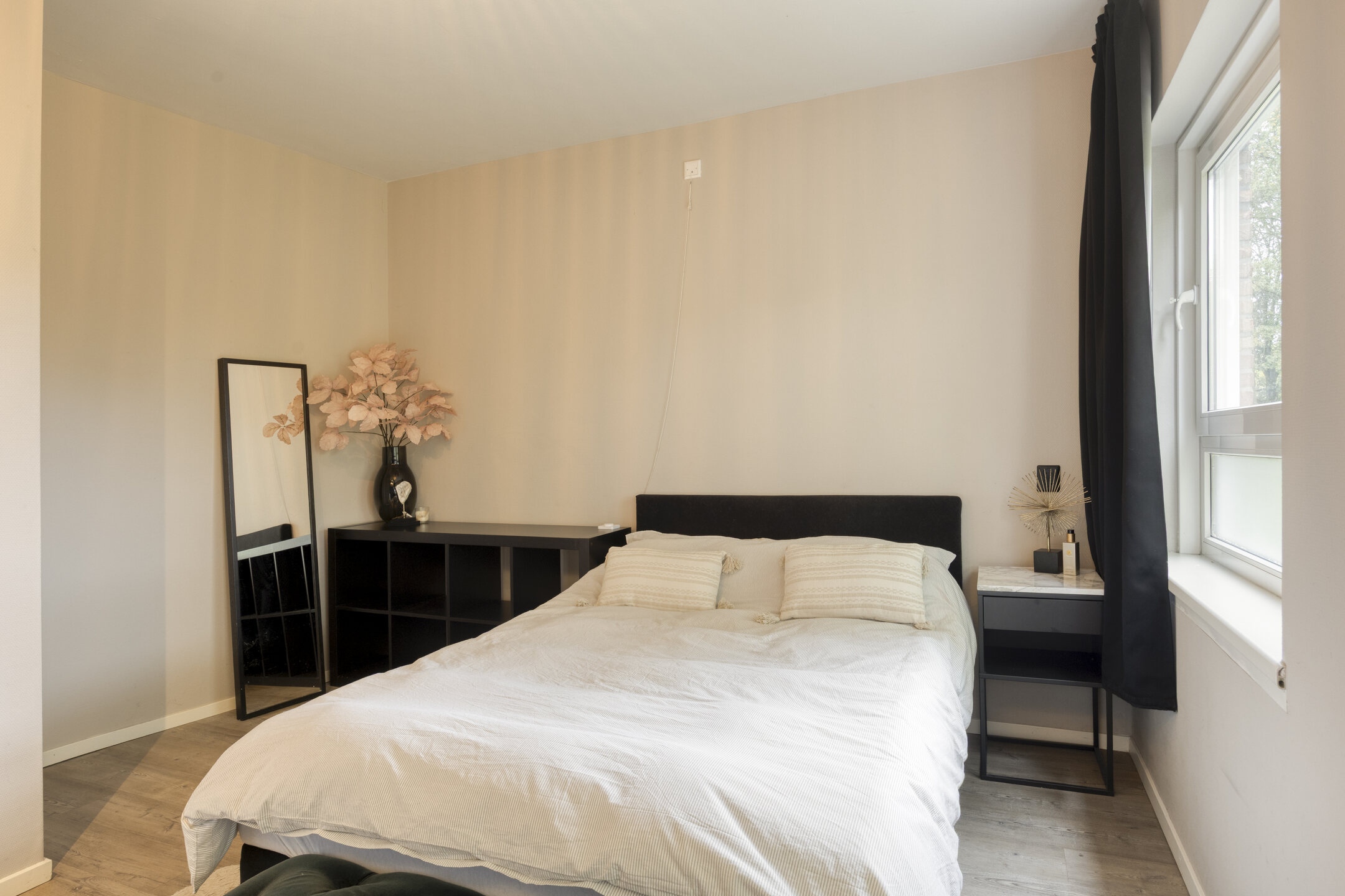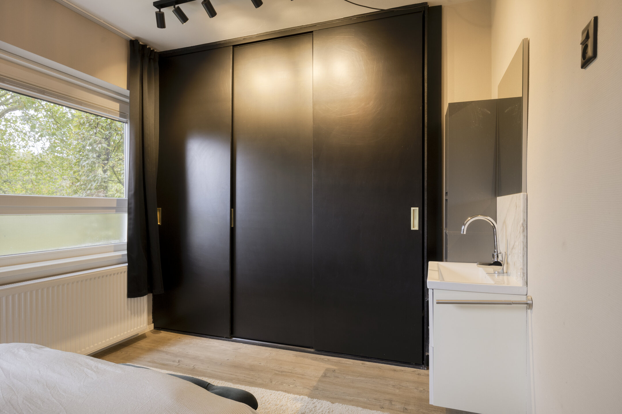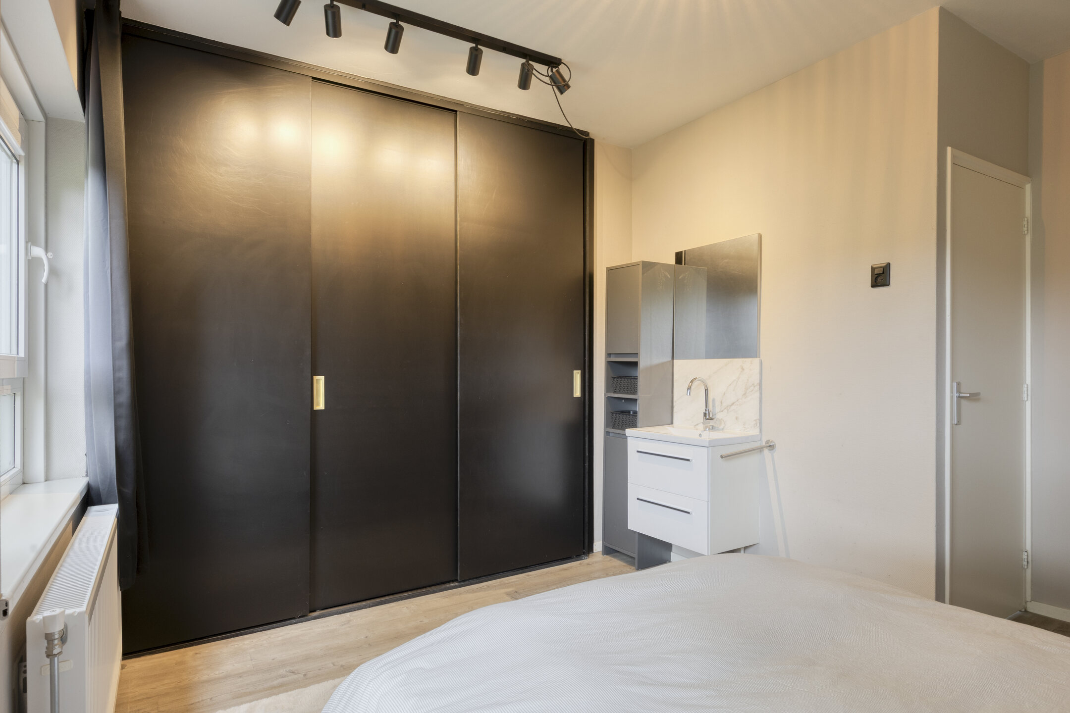 De ruime slaapkamer beschikt over een inbouwkast en een eigen wastafel. De moderne badkamer is voorzien van een toilet en een douche.