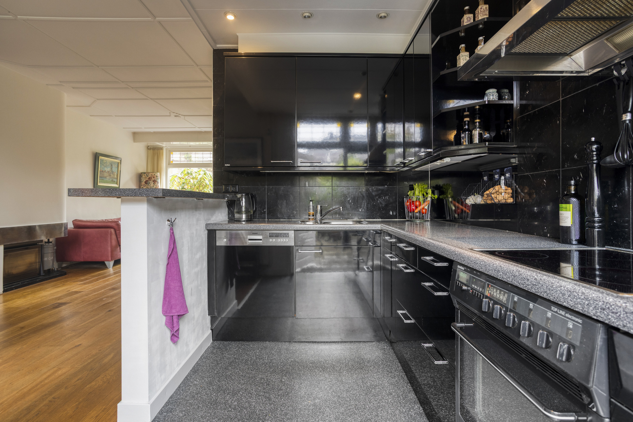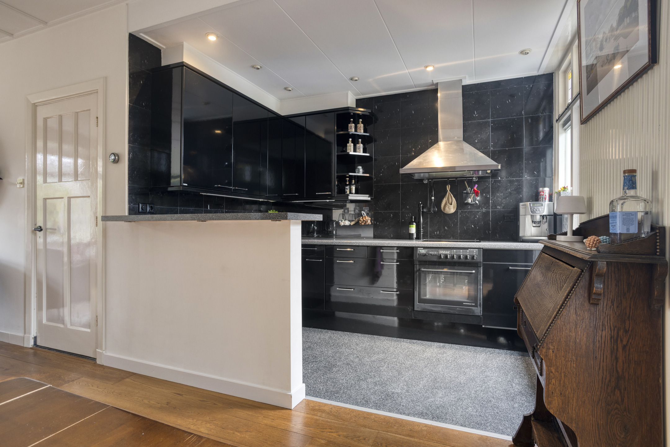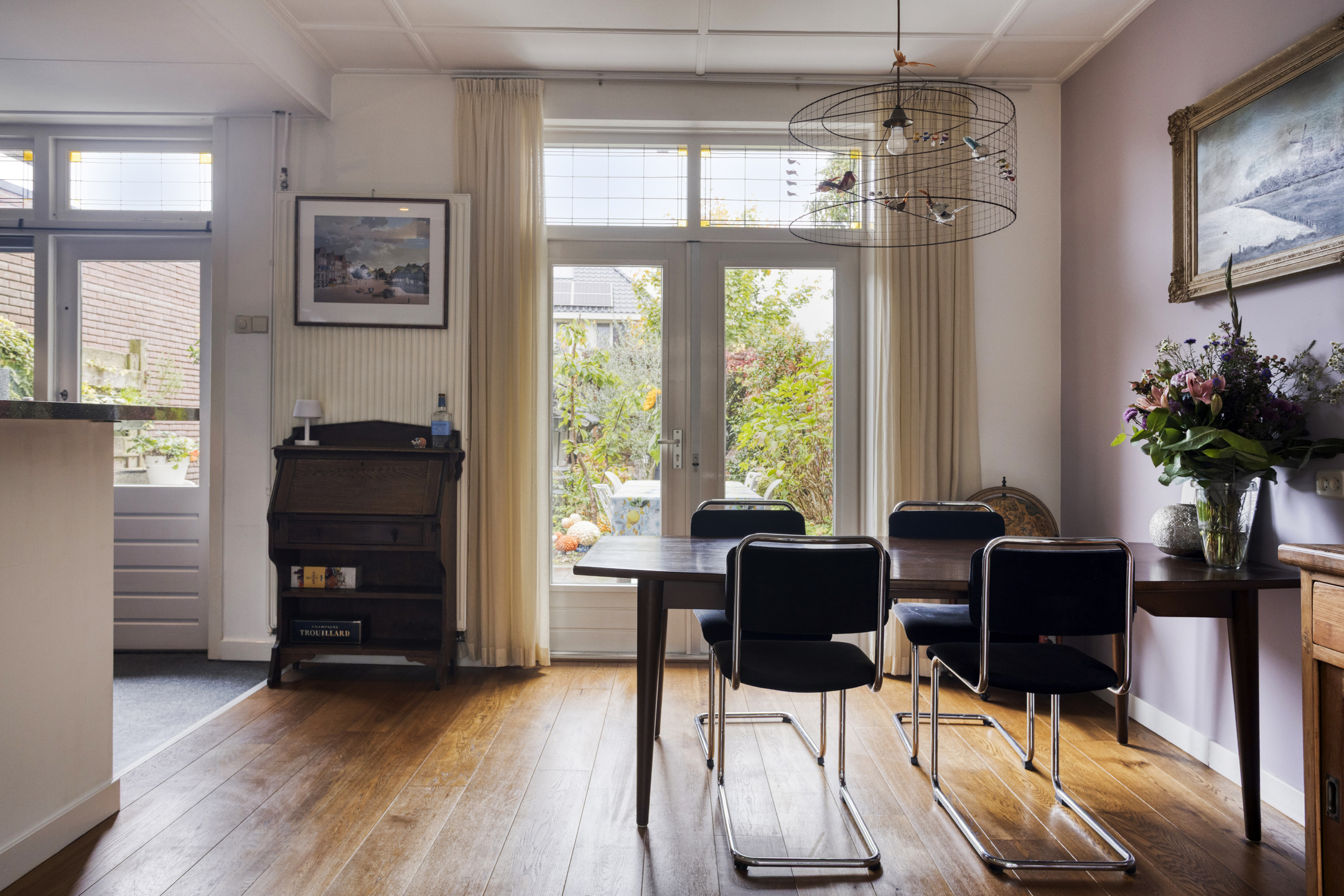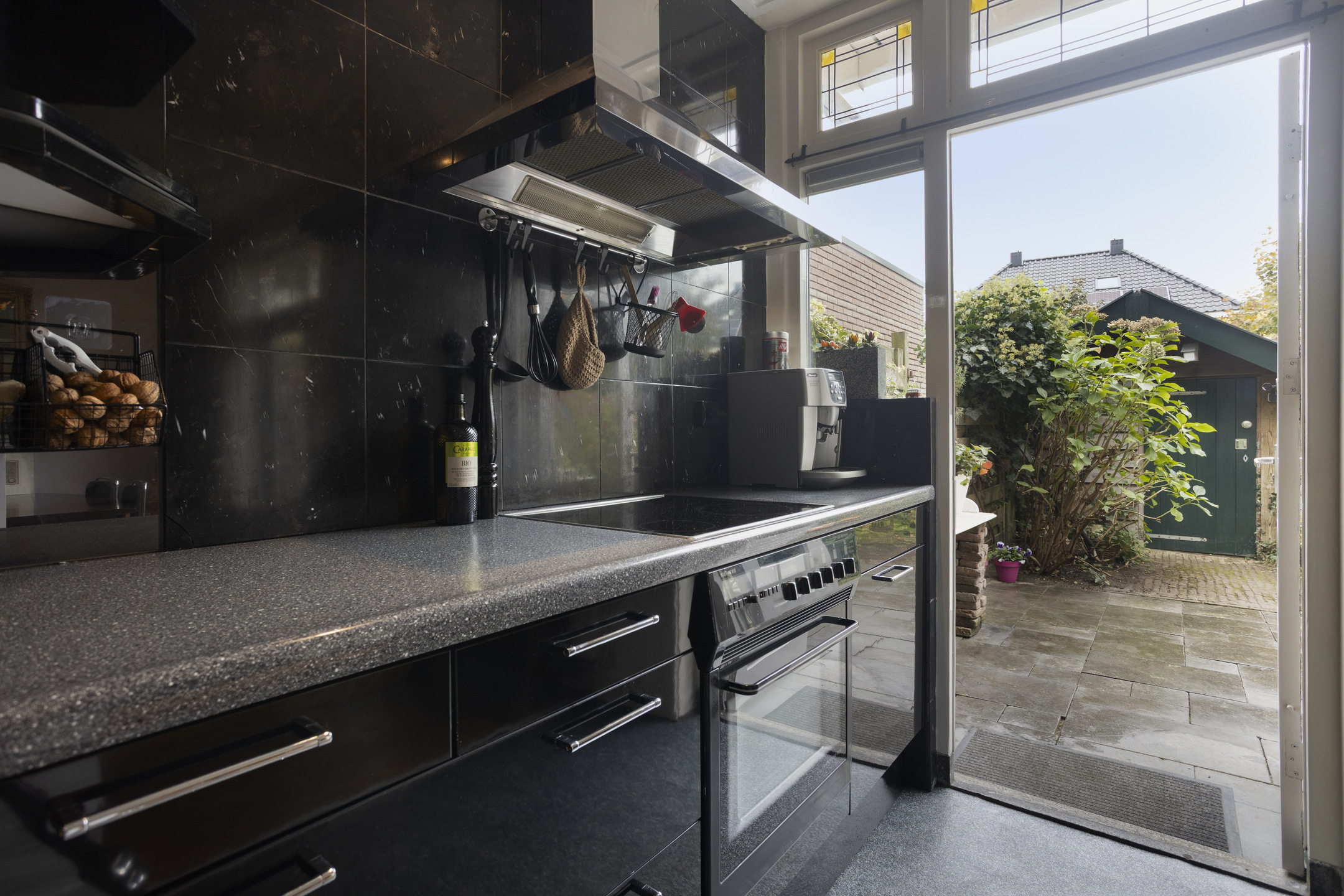 Vanuit de hal is er toegang tot de kelder en het toilet. De gezellige woonkamer is licht en sfeervol, met een houten vloer, Barbas-inzethaard en openslaande deuren naar de diepe achtertuin. De open keuken is uitgevoerd in hoogglans zwart en voorzien van alle benodigde inbouwapparatuur zoals een koelkast, elektrische kookplaat, afzuigkap, combi-oven en vaatwasser.