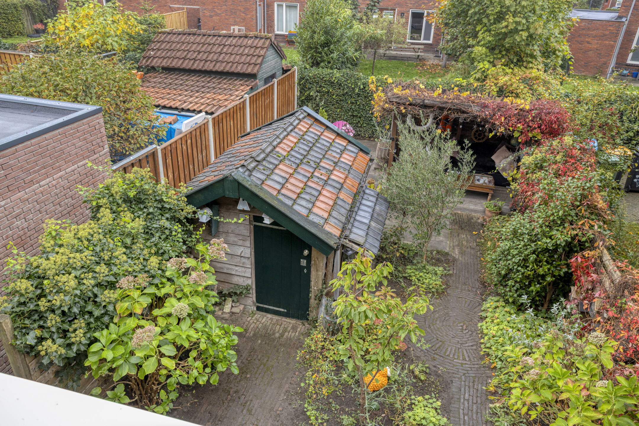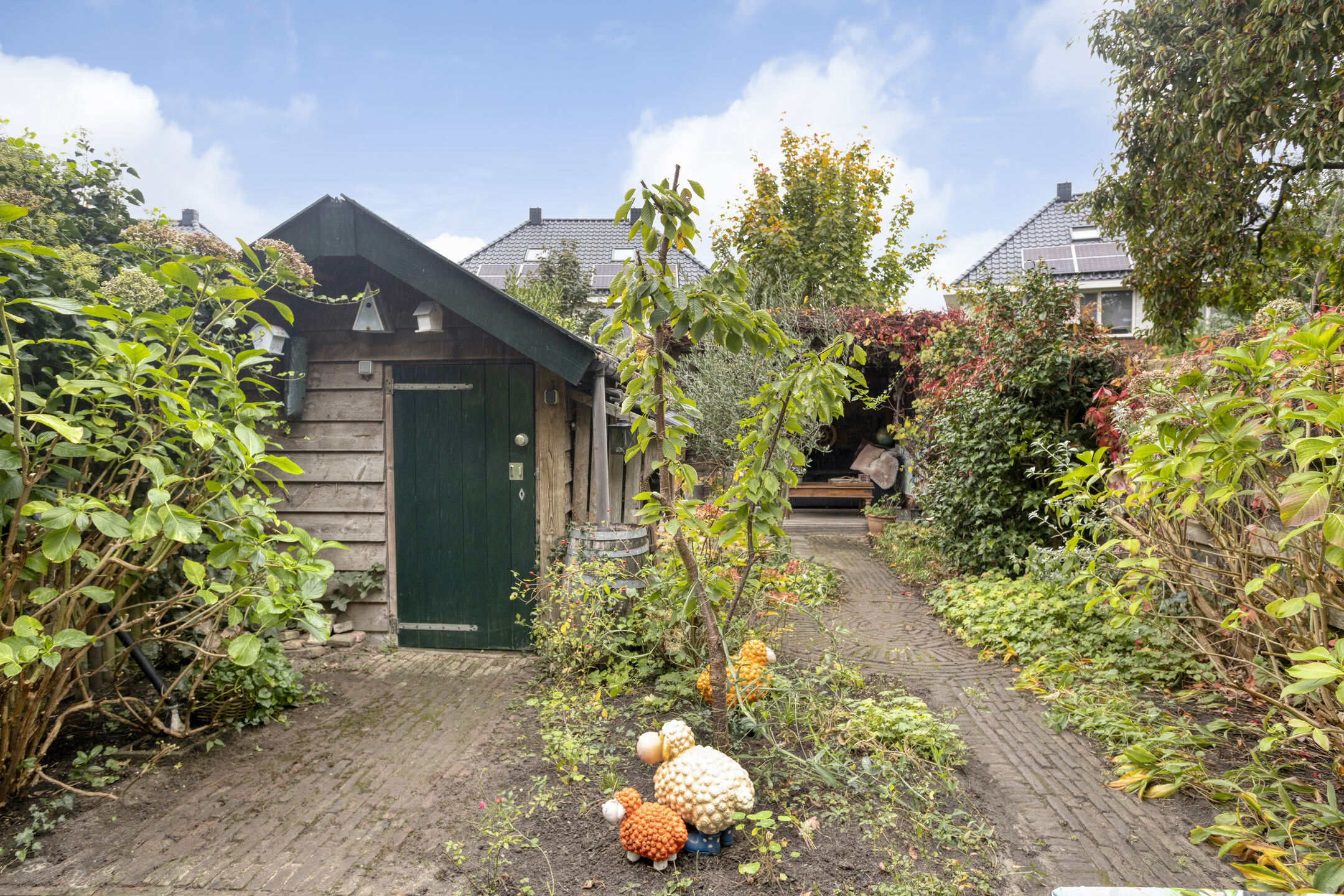De besloten achtertuin op het noordwesten is een groene oase van rust, met zowel zon als schaduw, twee terrassen, een veranda en een handige, houten berging. Bovendien is er een afsluitbare achterom.