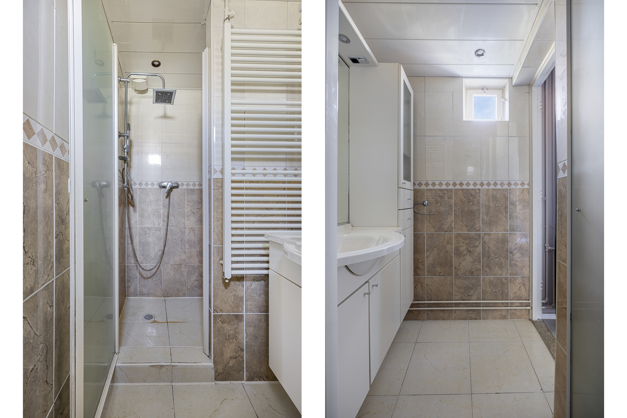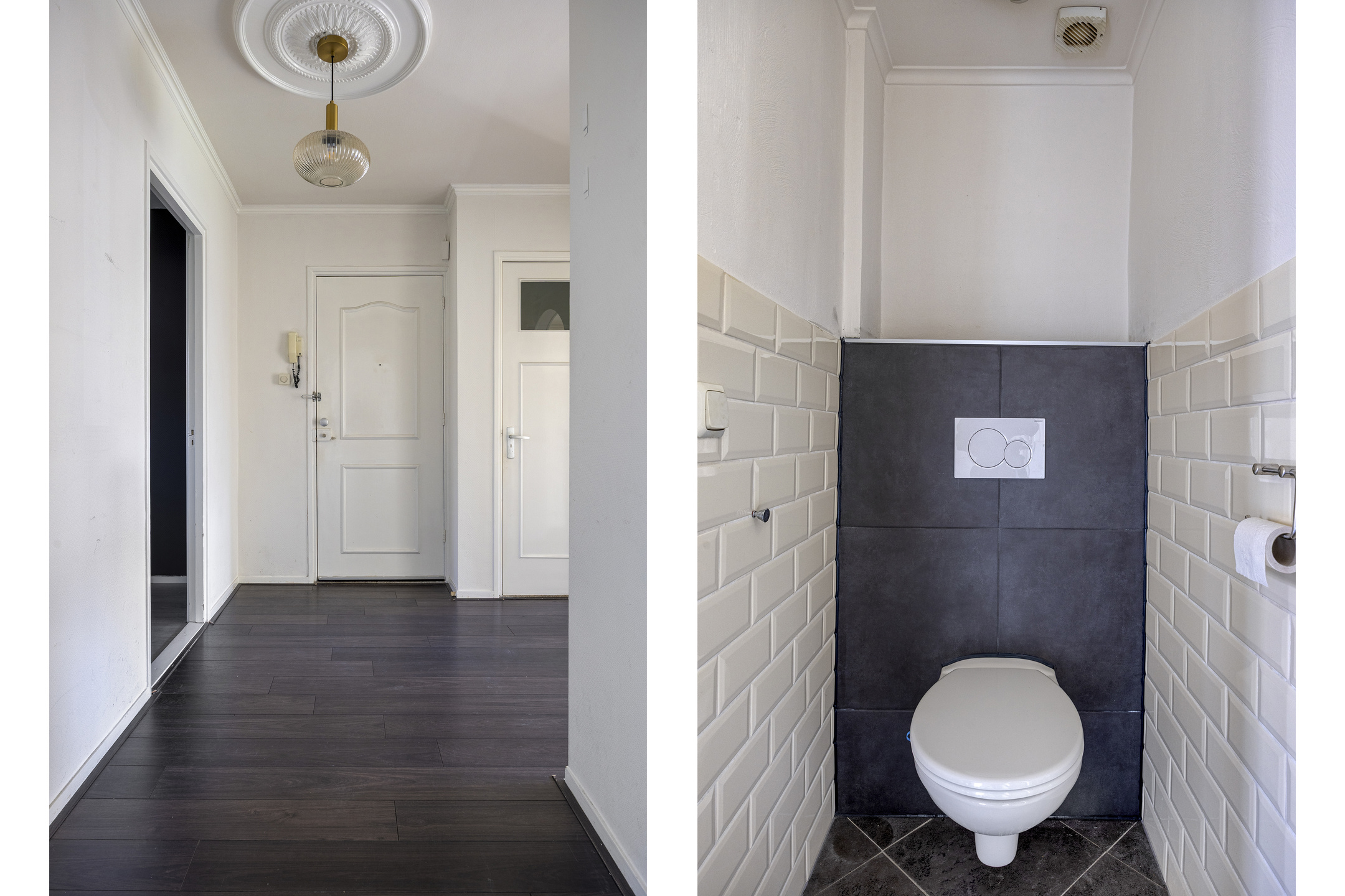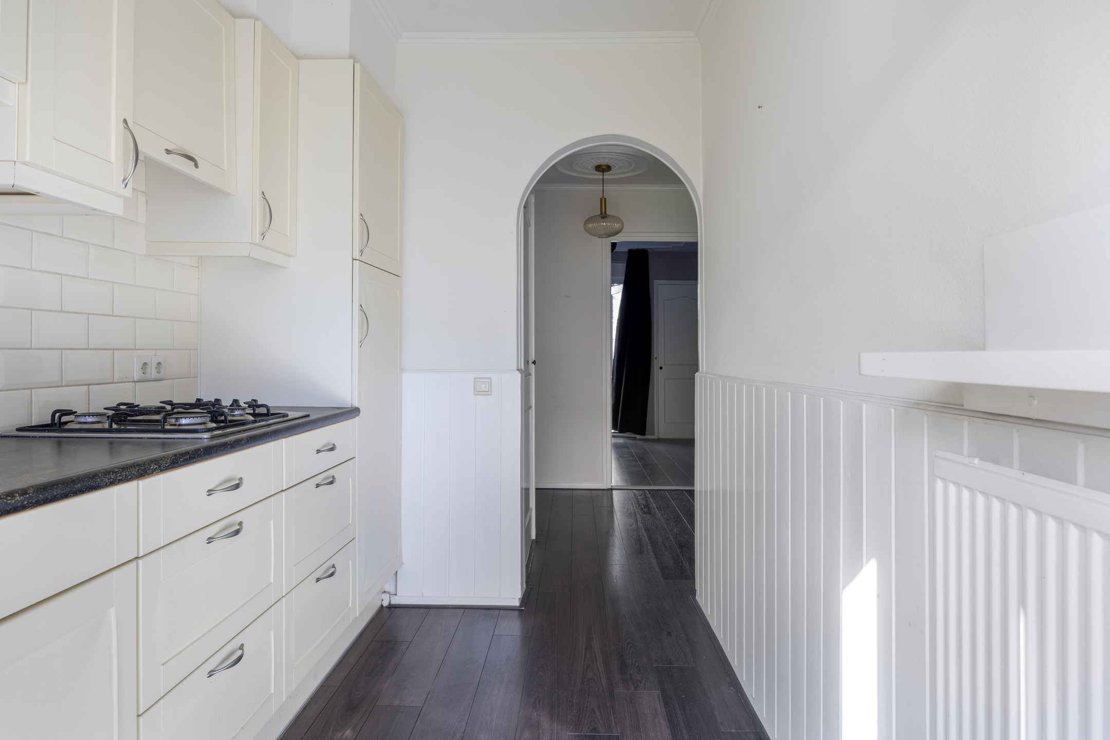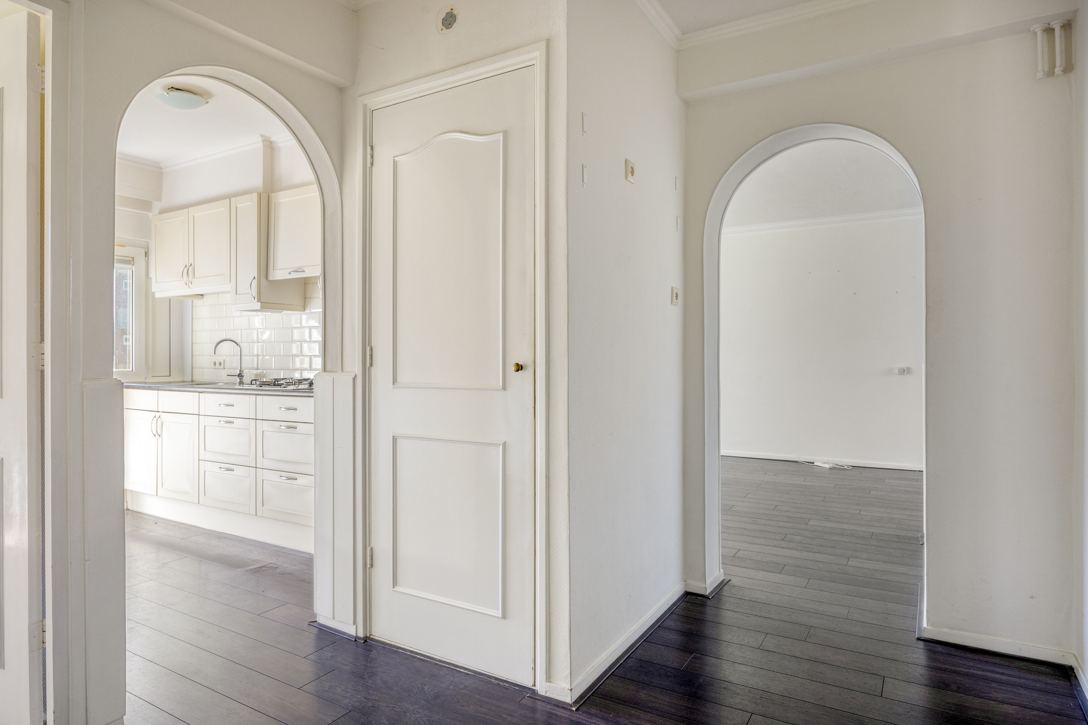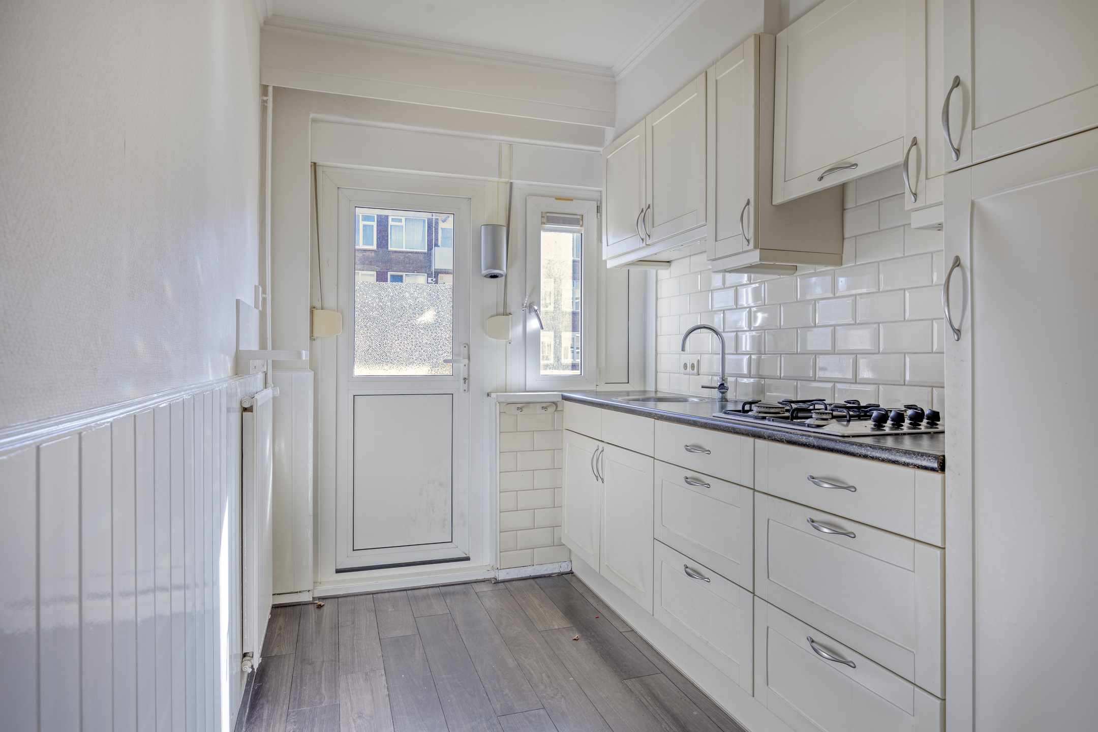 Binnenkomst in een royale hal met een vernieuwd, modern, zwevend toilet met fontein. De nette keuken is voorzien van een koelkast, gaskookplaat en afzuigkap en biedt toegang tot het balkon aan de zonnige zuidzijde – een heerlijke plek om van de zon te genieten.