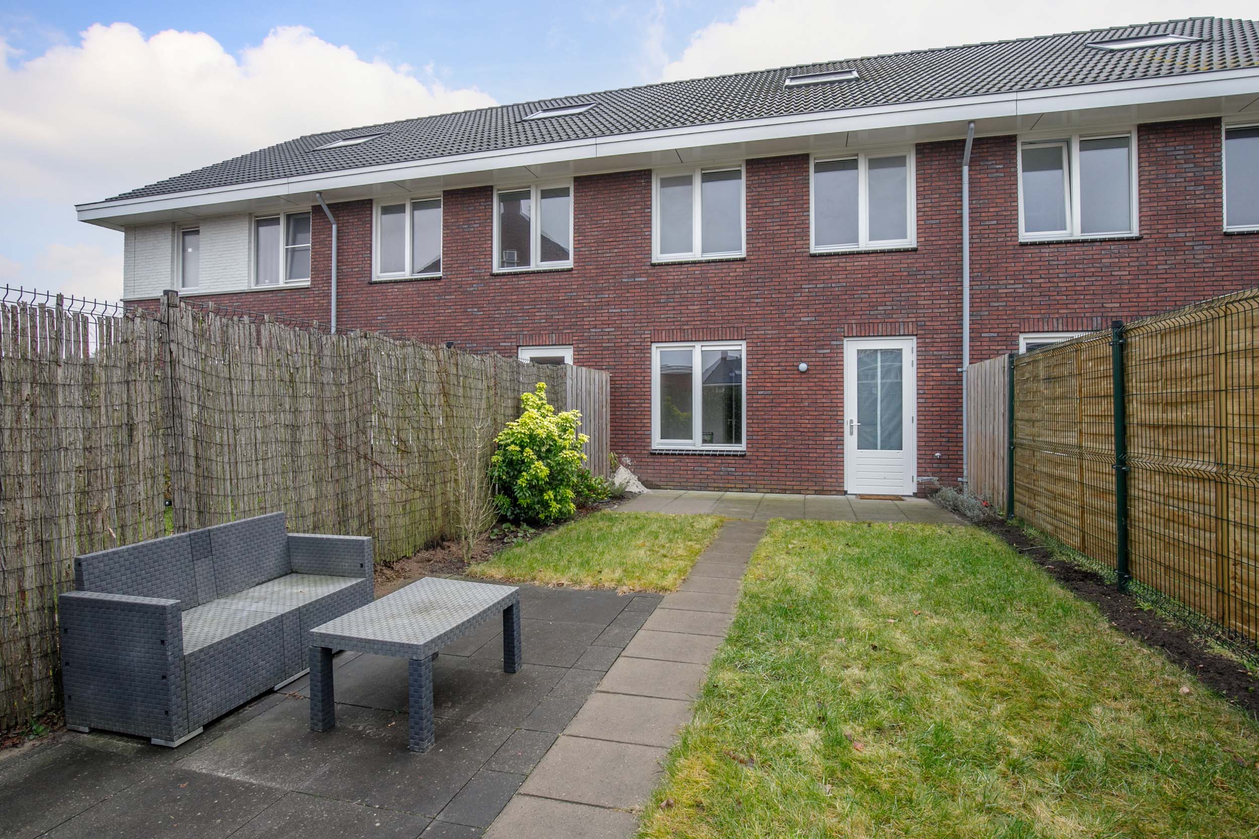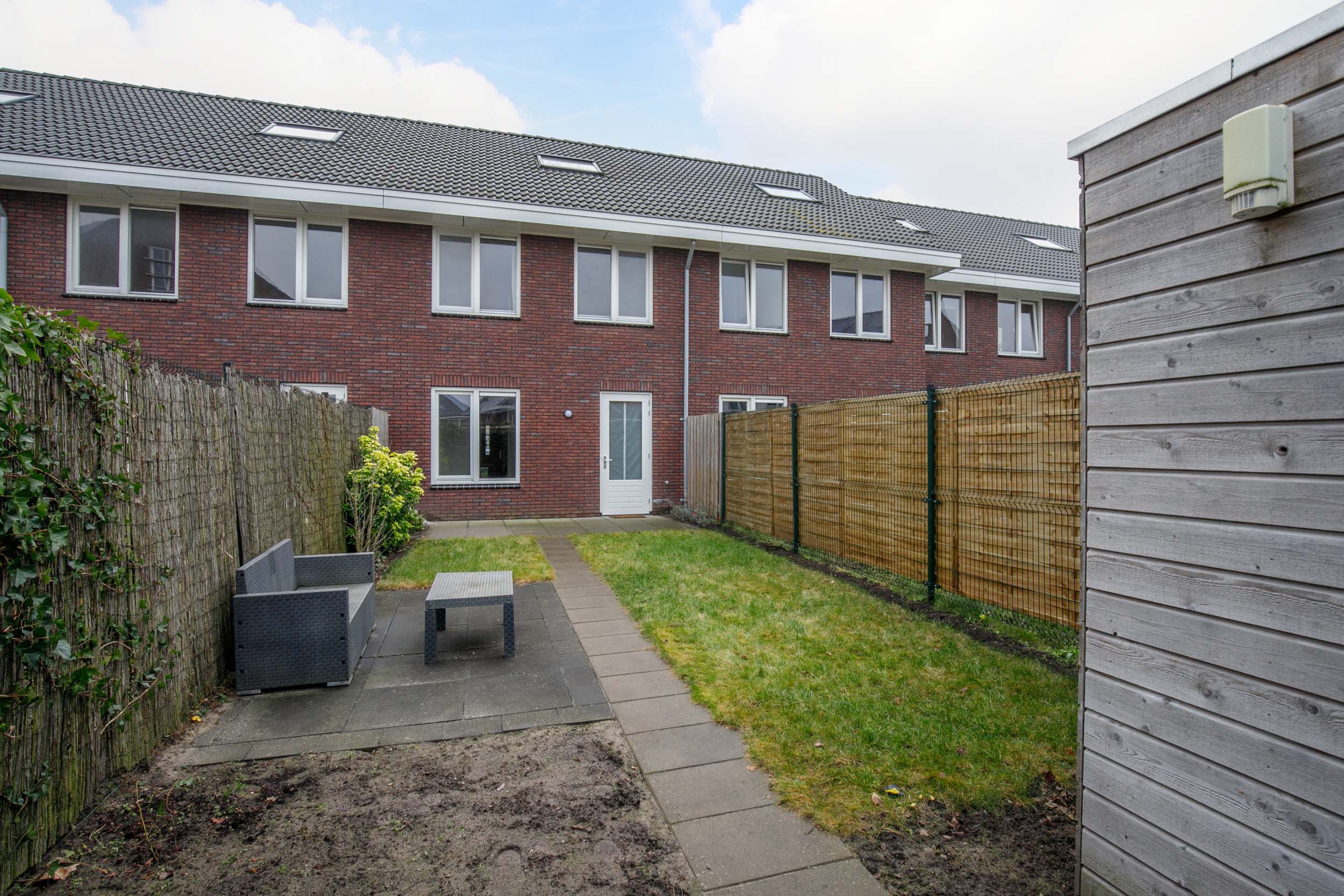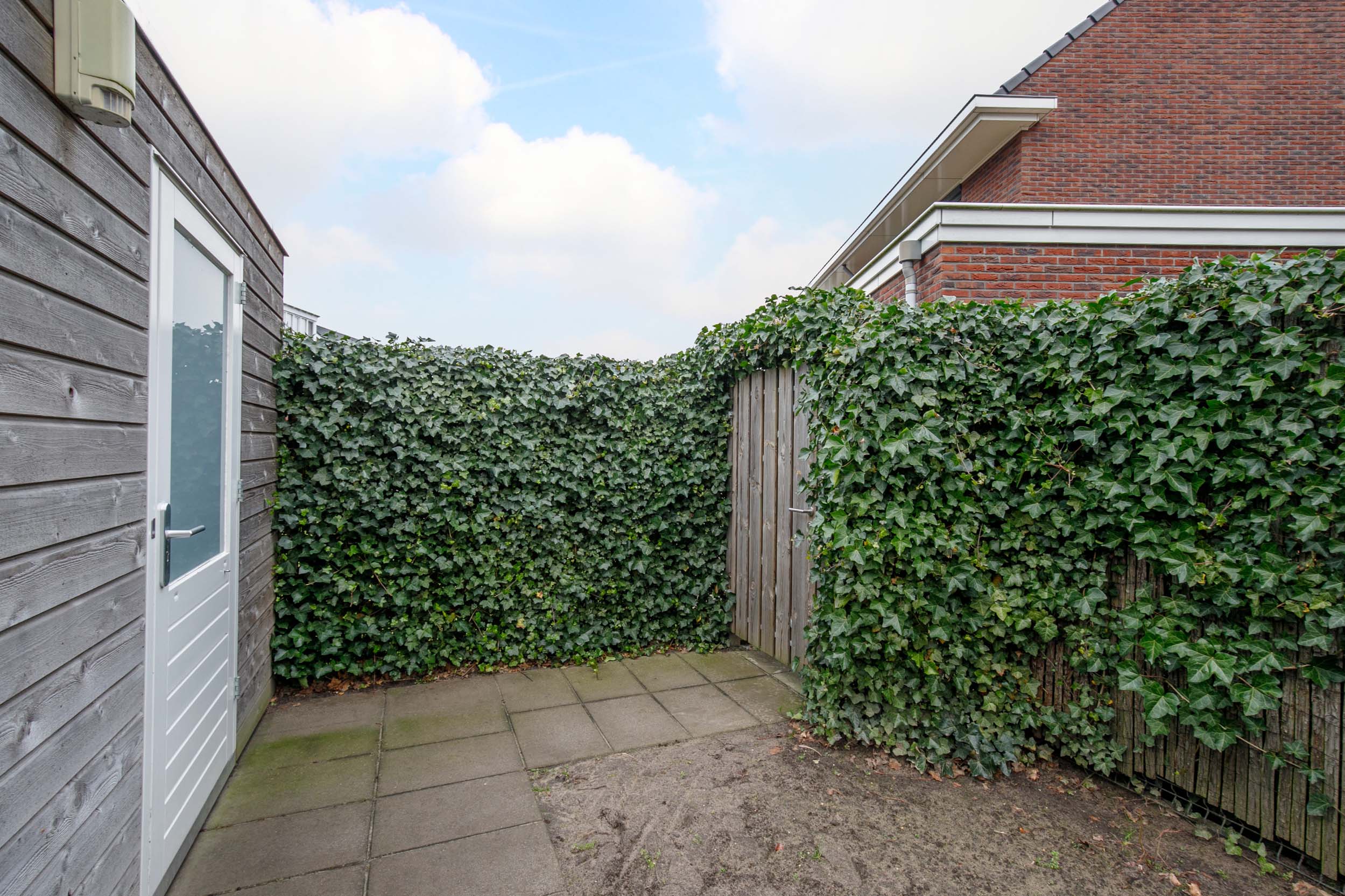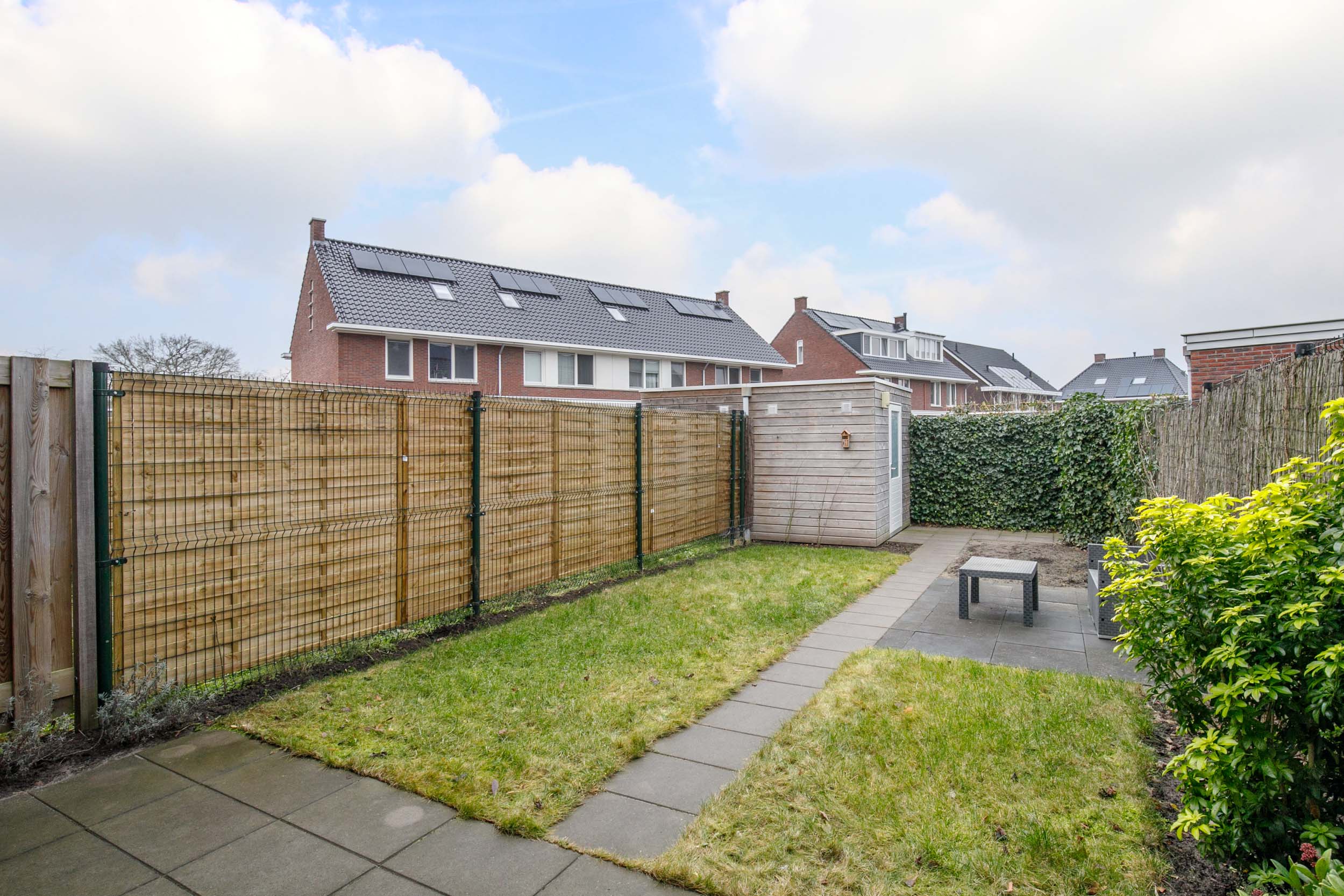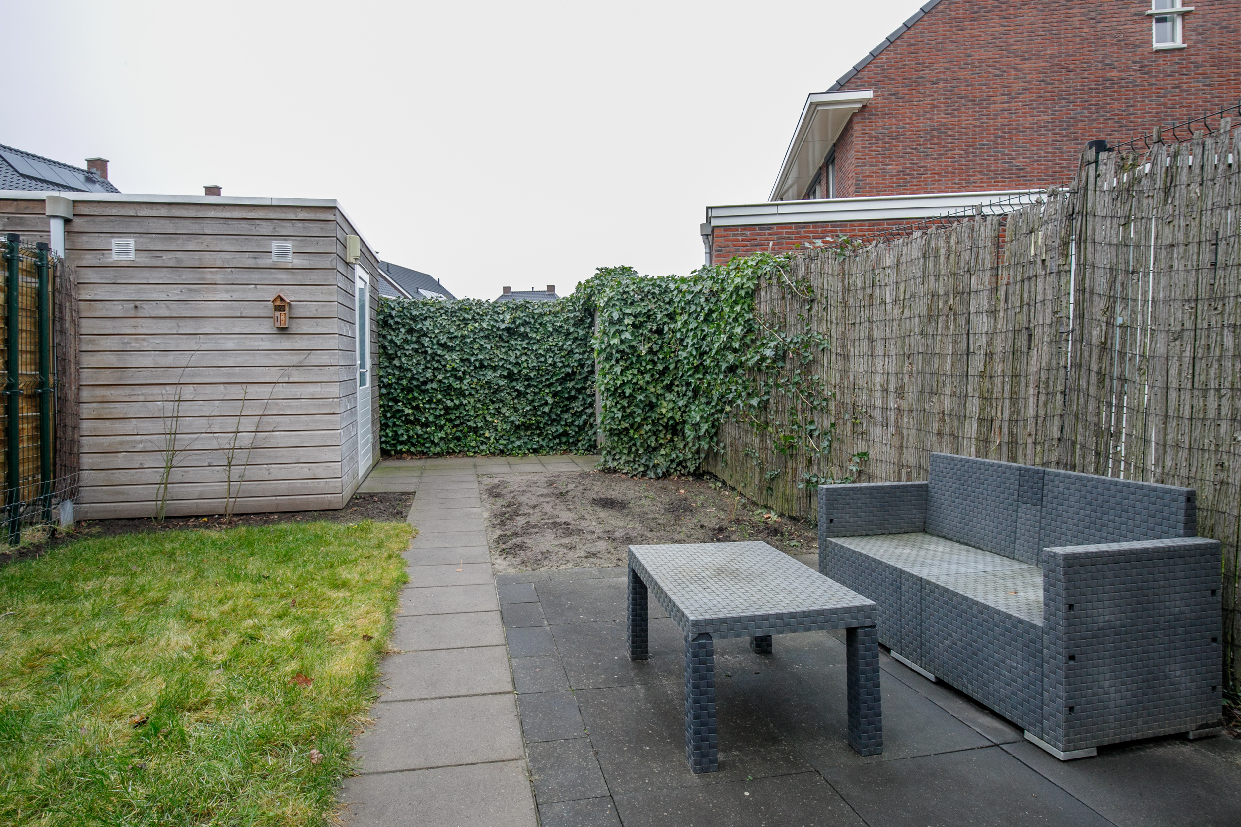 De tuin is op het noordwesten gelegen maar door een prima diepte is er de gehele dag zon aanwezig. Aan de achterzijde is een berging en de tuin is ook achterom bereikbaar.