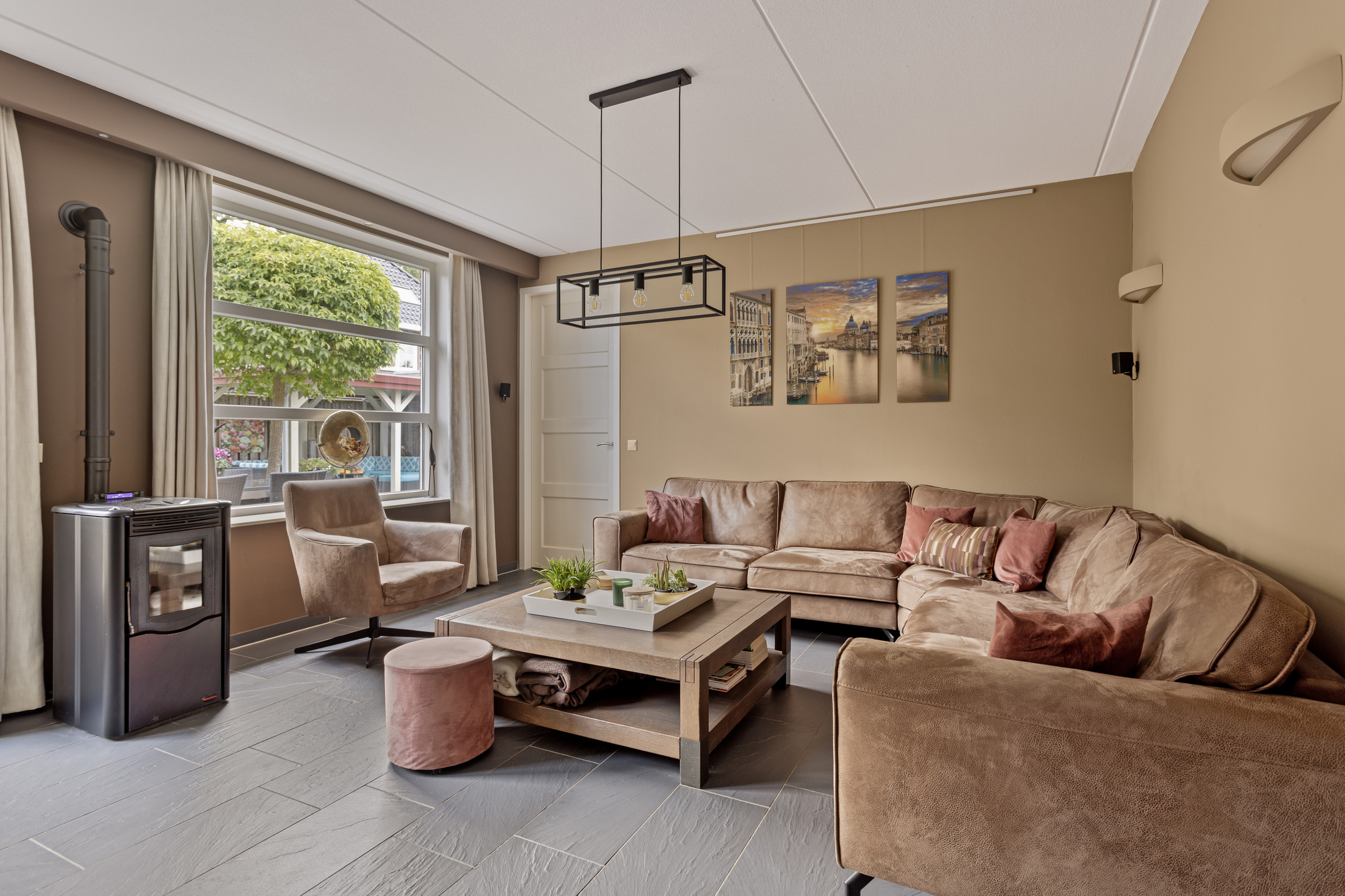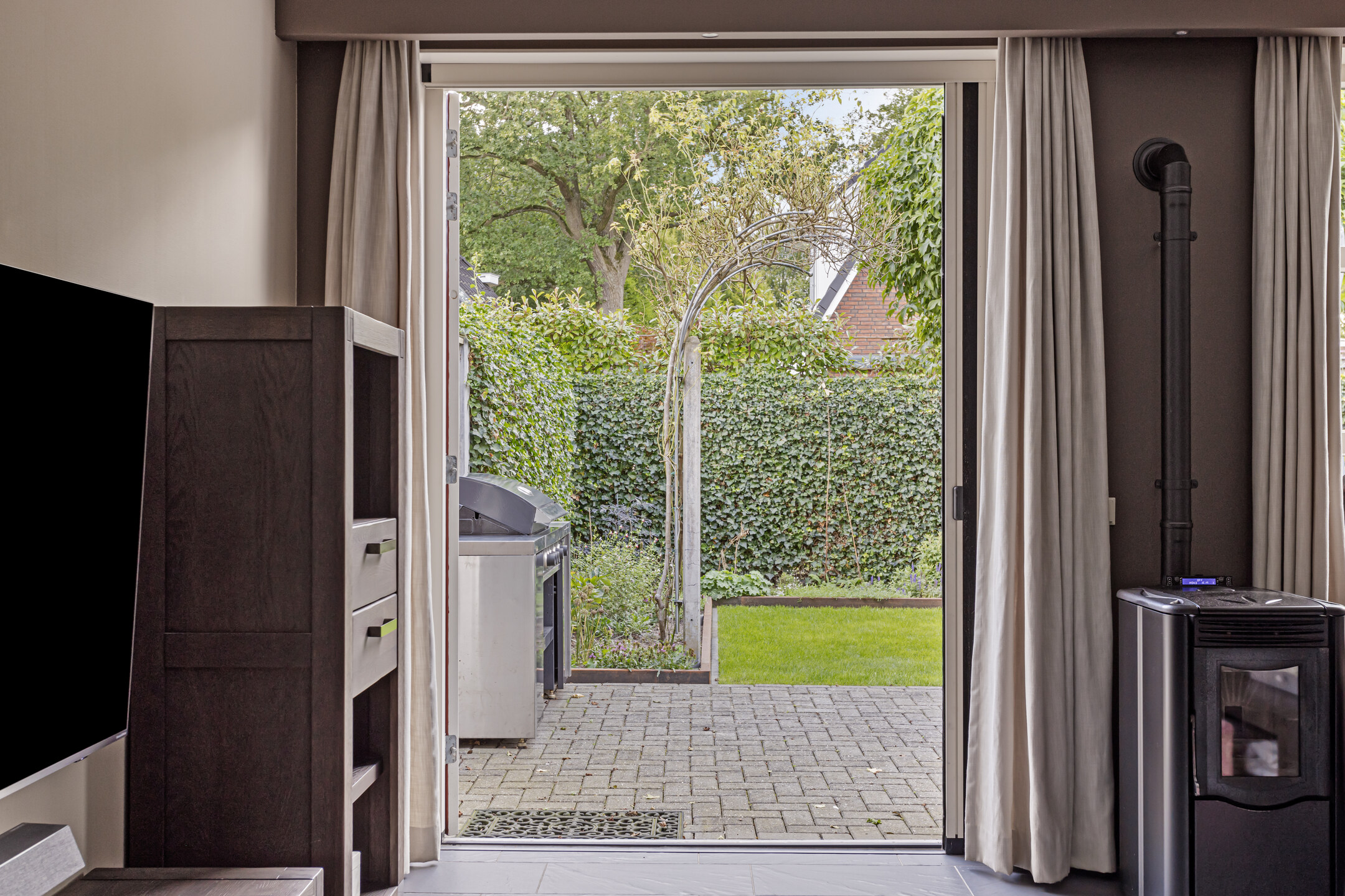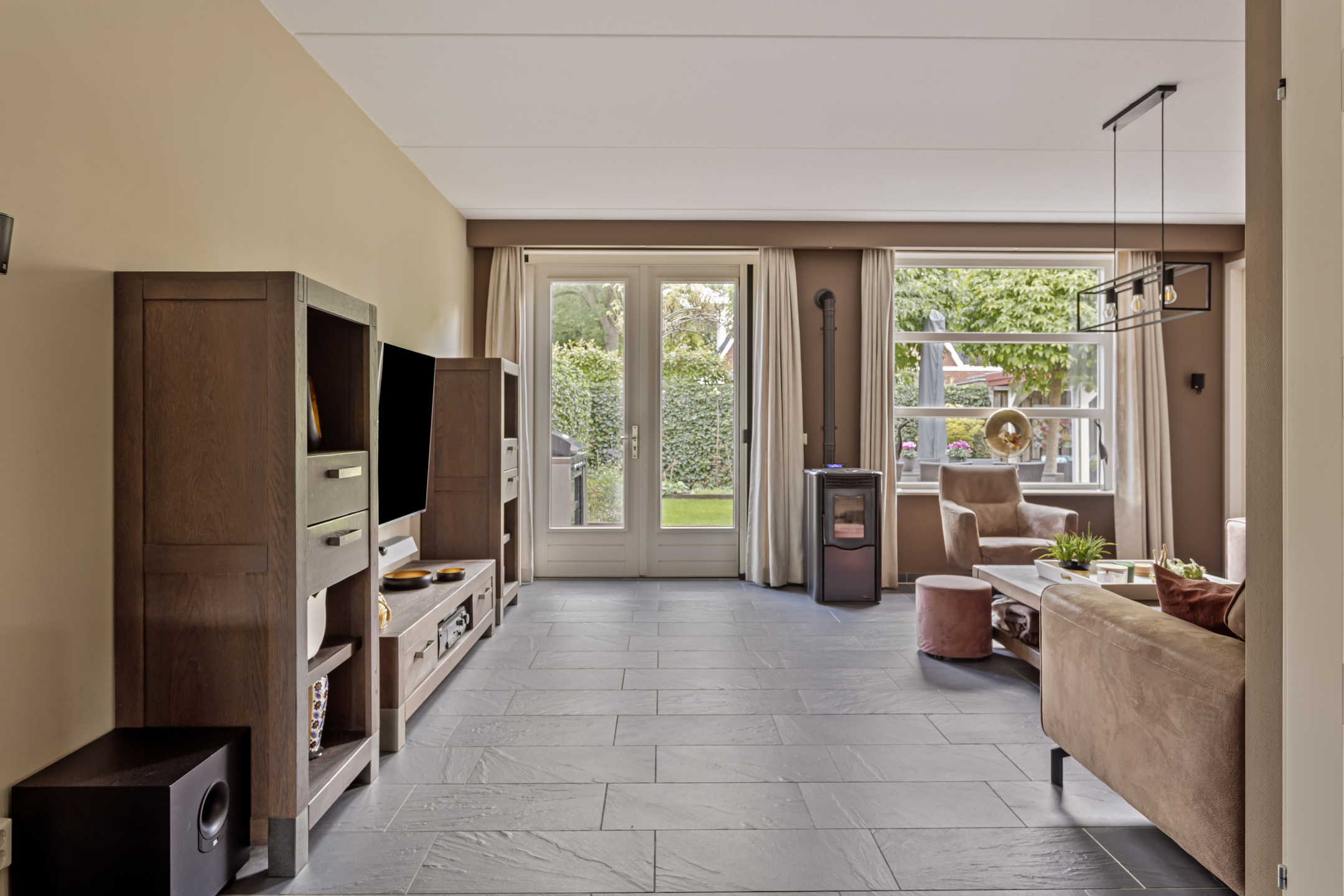 Via de ruime entree kom je binnen in de hal, waar zich de meterkast, het toilet met fonteintje én praktische vaste opbergkasten bevinden. De royale en lichte woonkamer is gelegen aan de achterzijde van de woning en beschikt over openslaande deuren naar de tuin, waardoor binnen en buiten mooi in elkaar overlopen. Een sfeervolle pelletkachel zorgt voor extra warmte en gezelligheid. Vanuit de woonkamer is de bijkeuken bereikbaar, keurig afgewerkt en voorzien van wasmachineaansluiting. Aangrenzend bevindt zich de inpandige berging, ideaal voor extra opslag of fietsen.