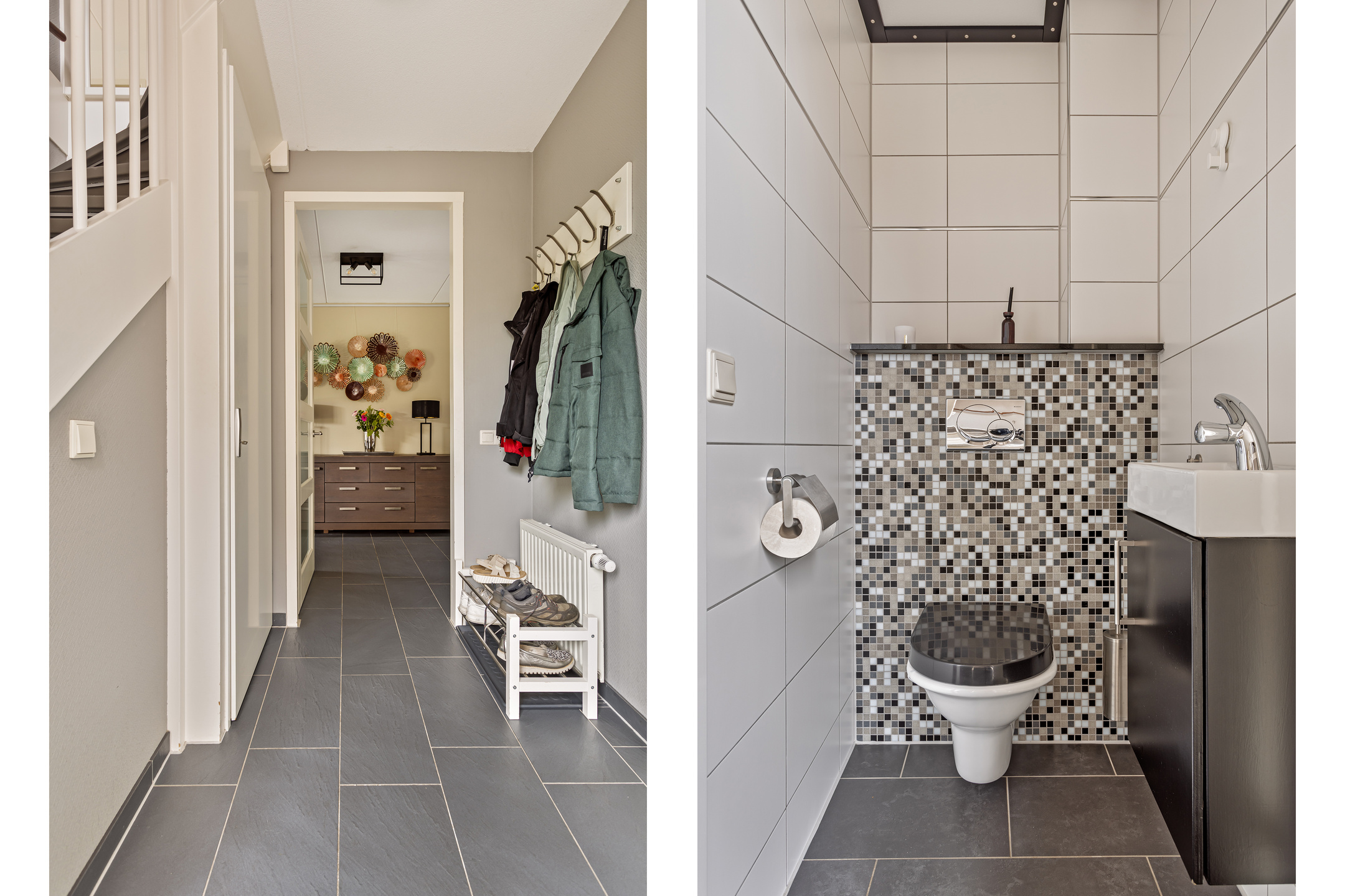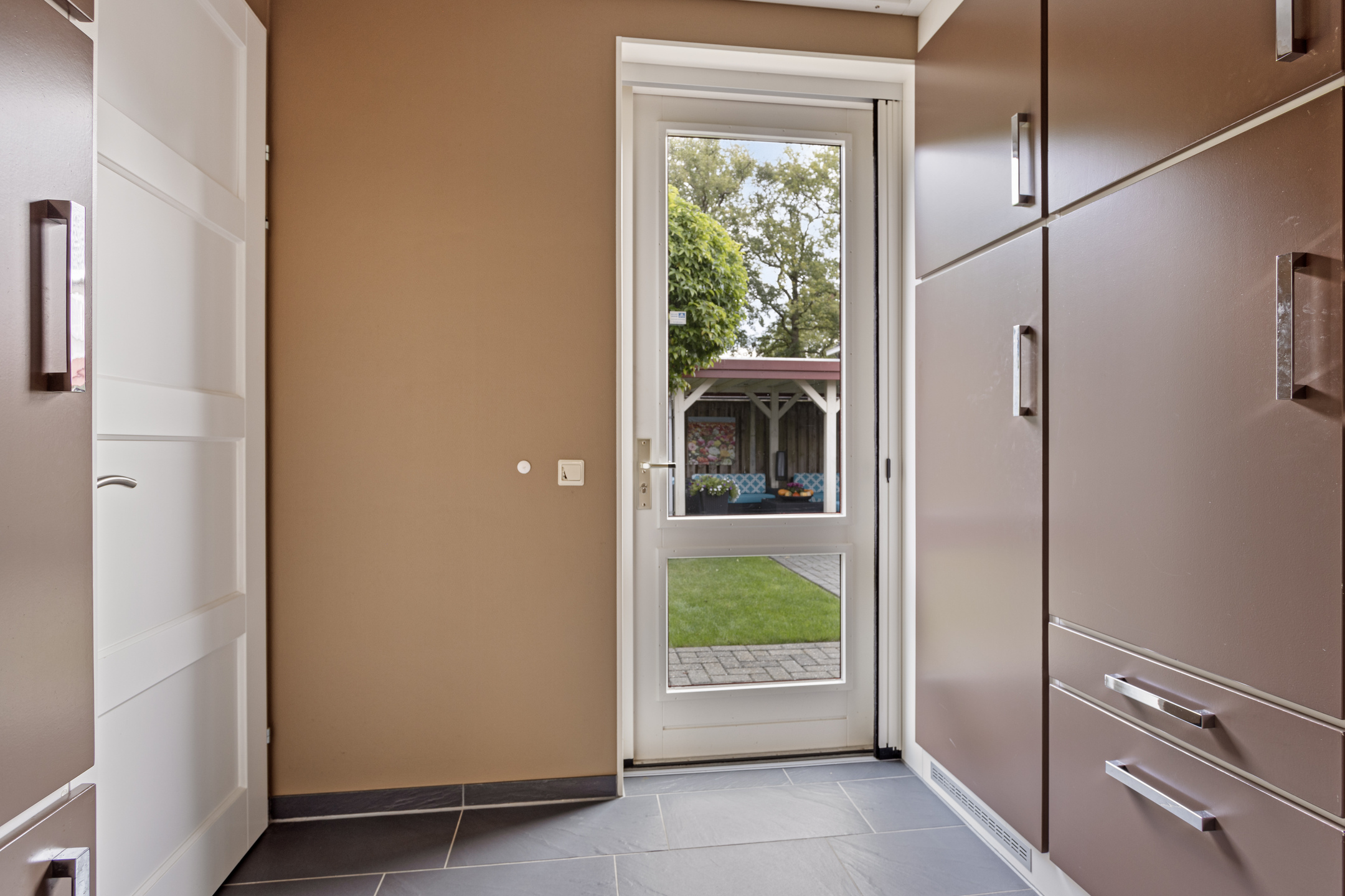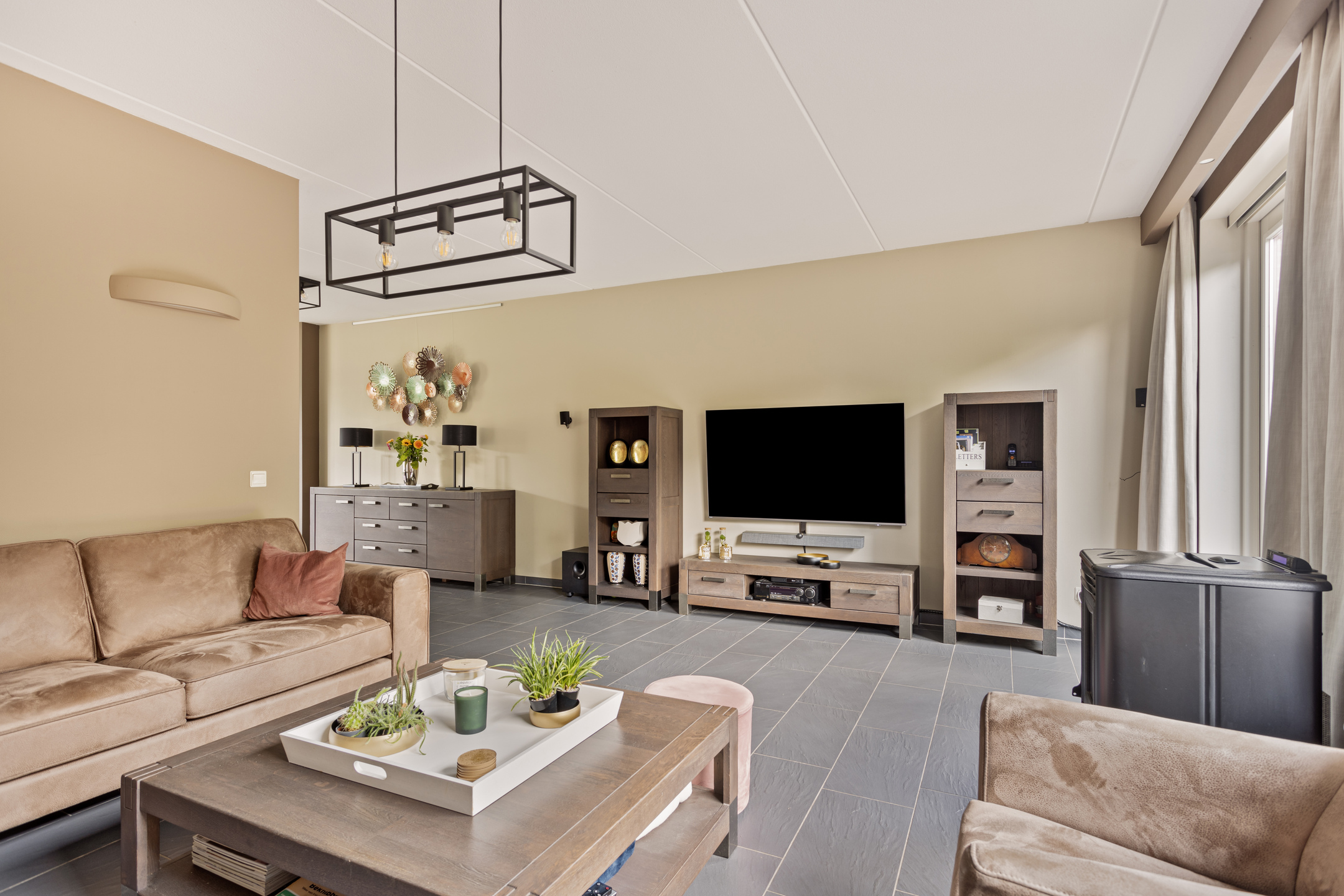 Via de ruime entree kom je binnen in de hal, waar zich de meterkast, het toilet met fonteintje én praktische vaste opbergkasten bevinden. De royale en lichte woonkamer is gelegen aan de achterzijde van de woning en beschikt over openslaande deuren naar de tuin, waardoor binnen en buiten mooi in elkaar overlopen. Een sfeervolle pelletkachel zorgt voor extra warmte en gezelligheid. Vanuit de woonkamer is de bijkeuken bereikbaar, keurig afgewerkt en voorzien van wasmachineaansluiting. Aangrenzend bevindt zich de inpandige berging, ideaal voor extra opslag of fietsen.