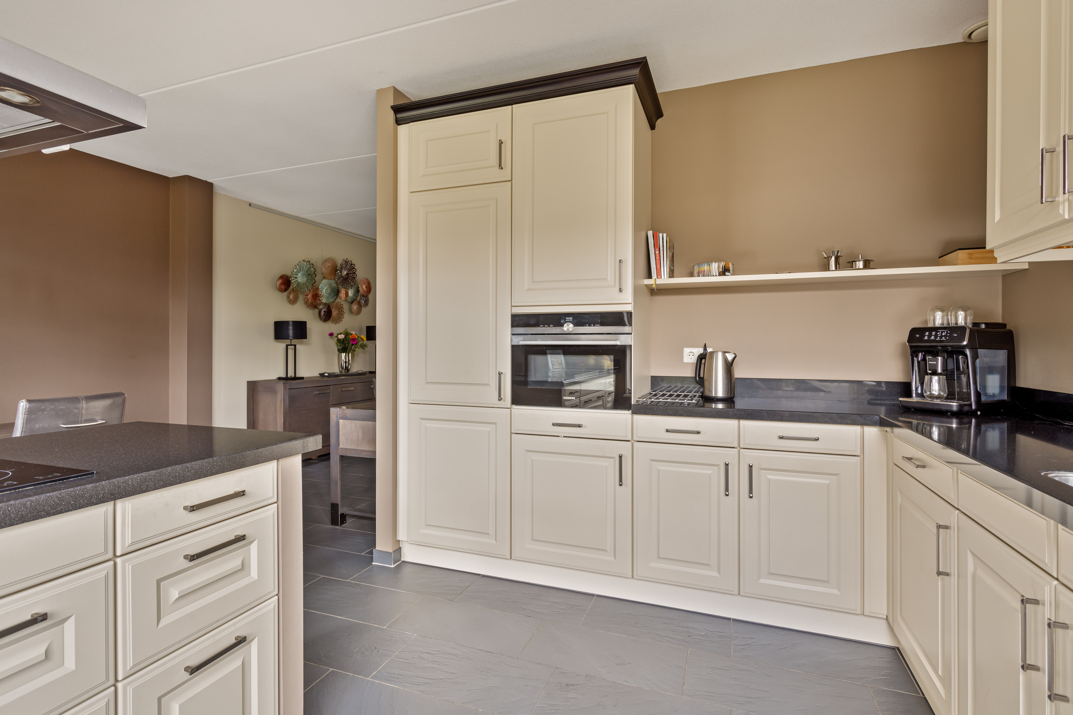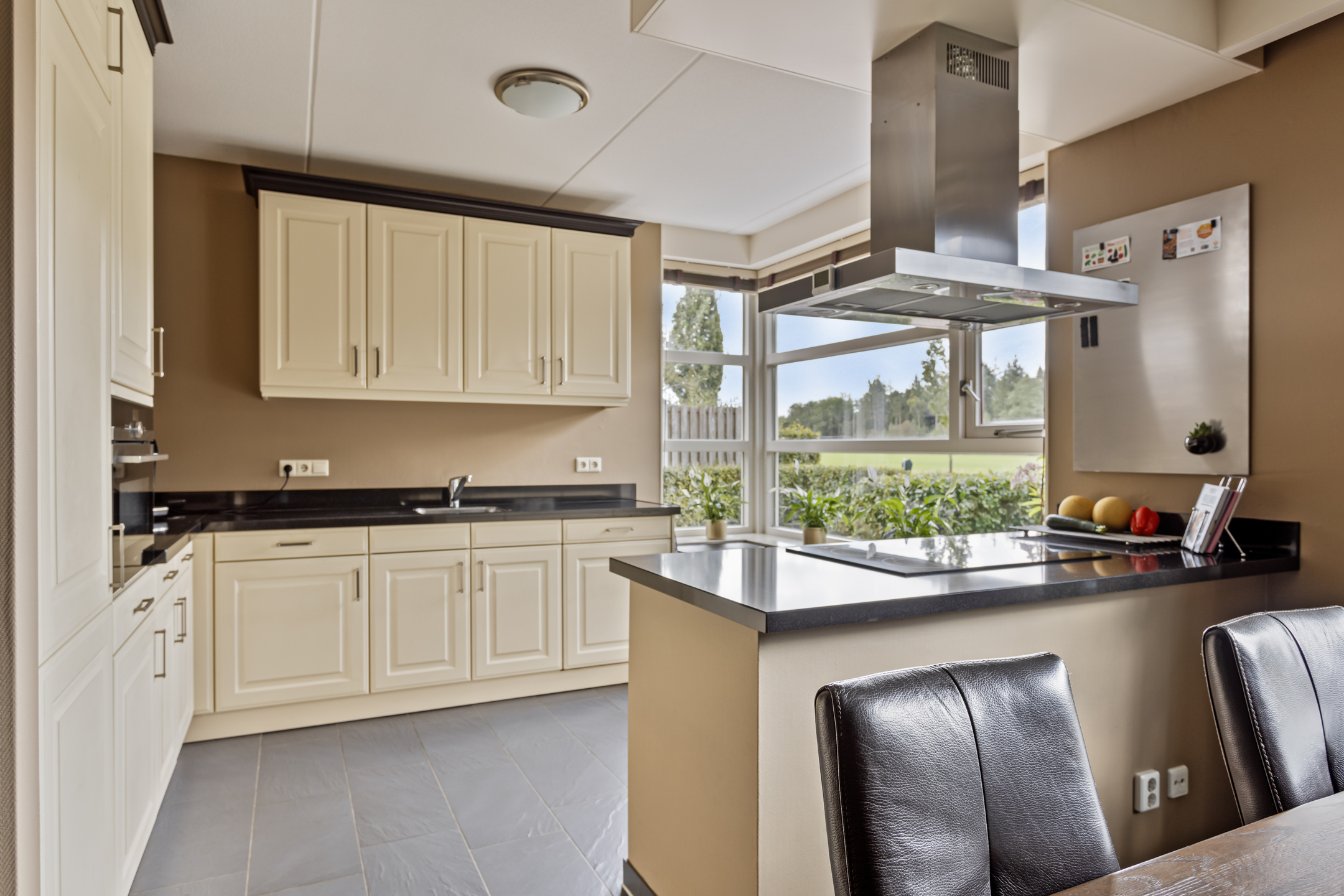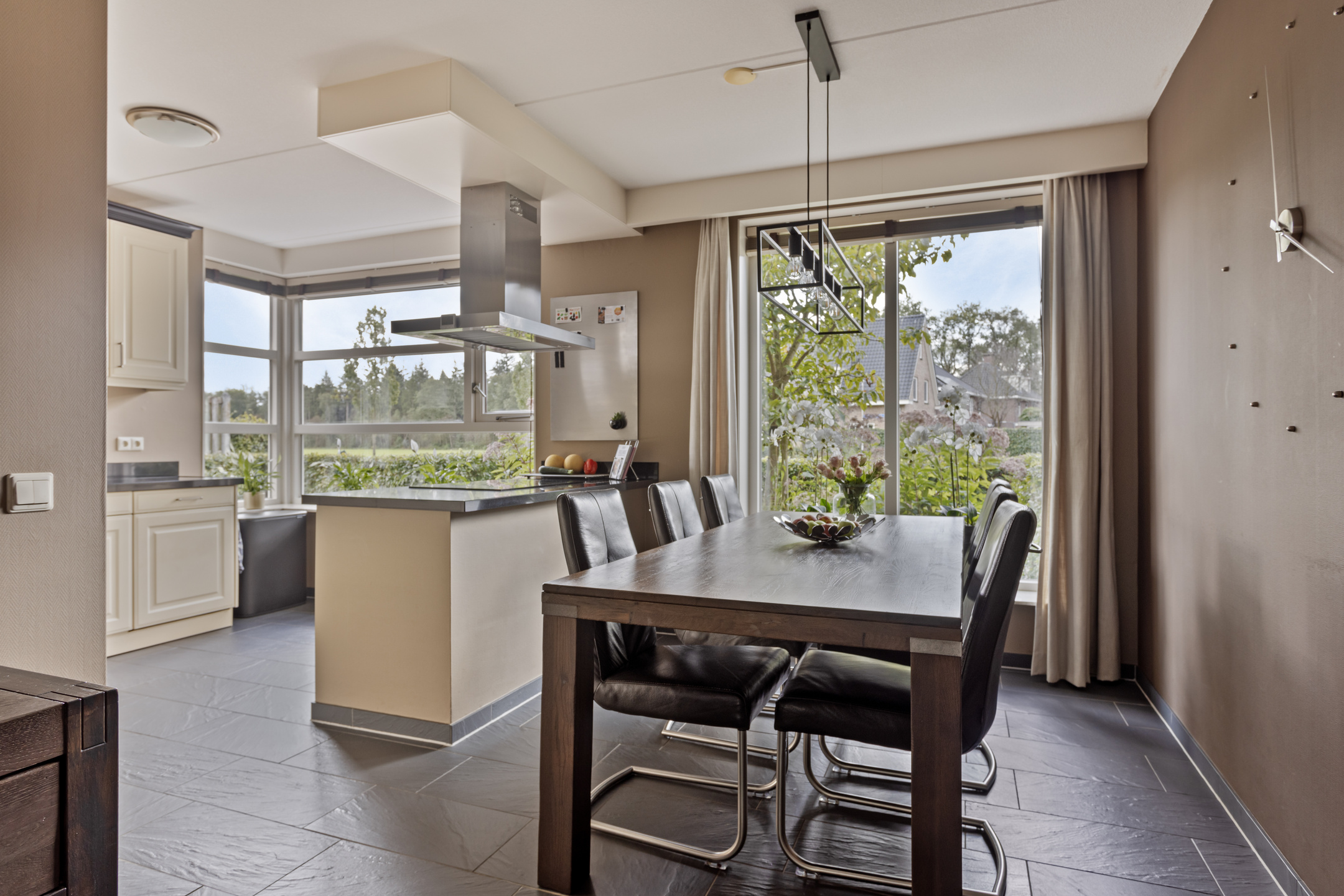Aan de voorzijde van de woning vind je de ruime woonkeuken, waar plek is voor een grote eettafel. De keuken staat in directe verbinding met het centraal geplaatste kookeiland en is uitgerust met inbouwapparatuur, waaronder een inductiekookplaat, afzuigkap, vaatwasser, koelkast en oven. De gehele begane grond is voorzien van comfortabele vloerverwarming.