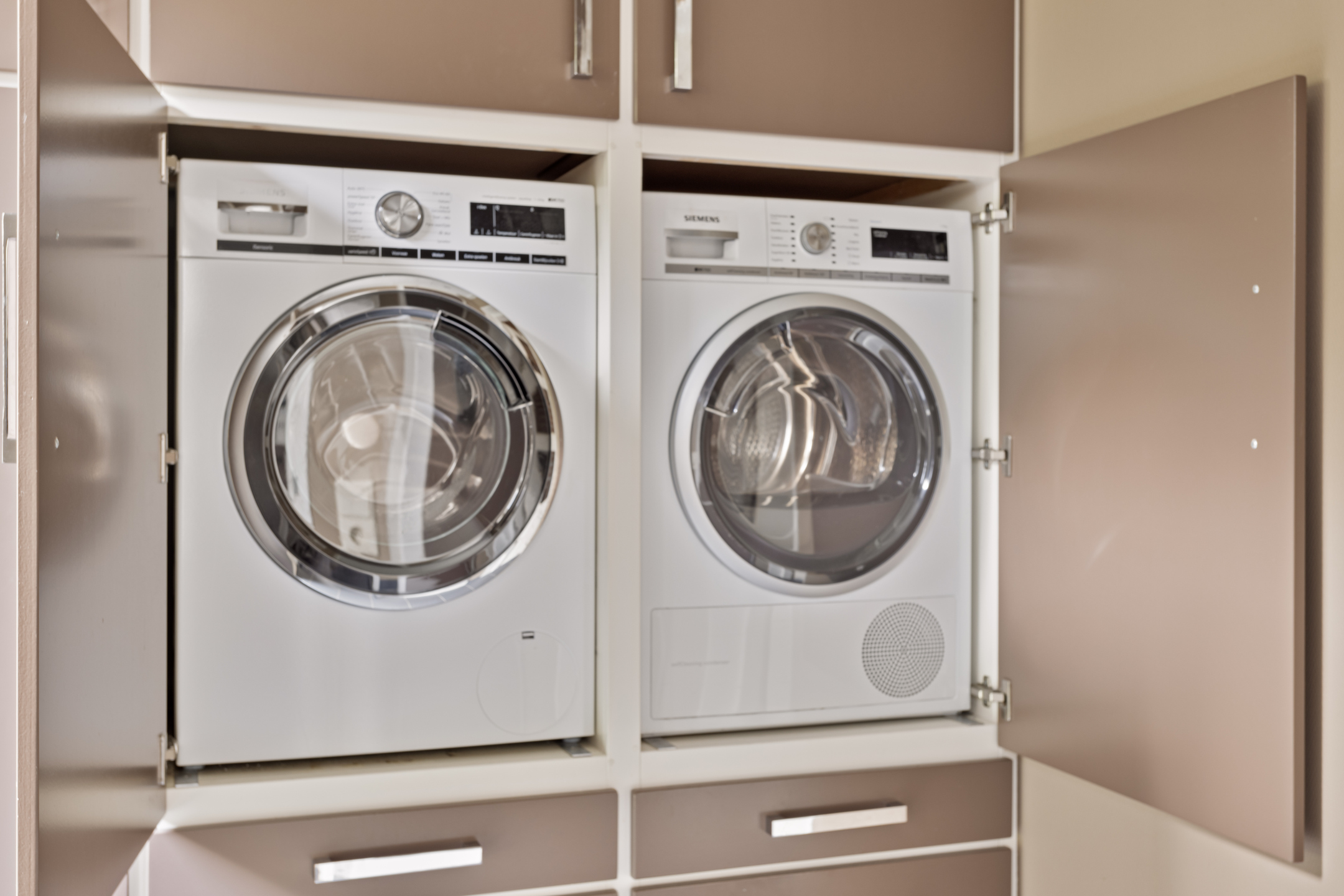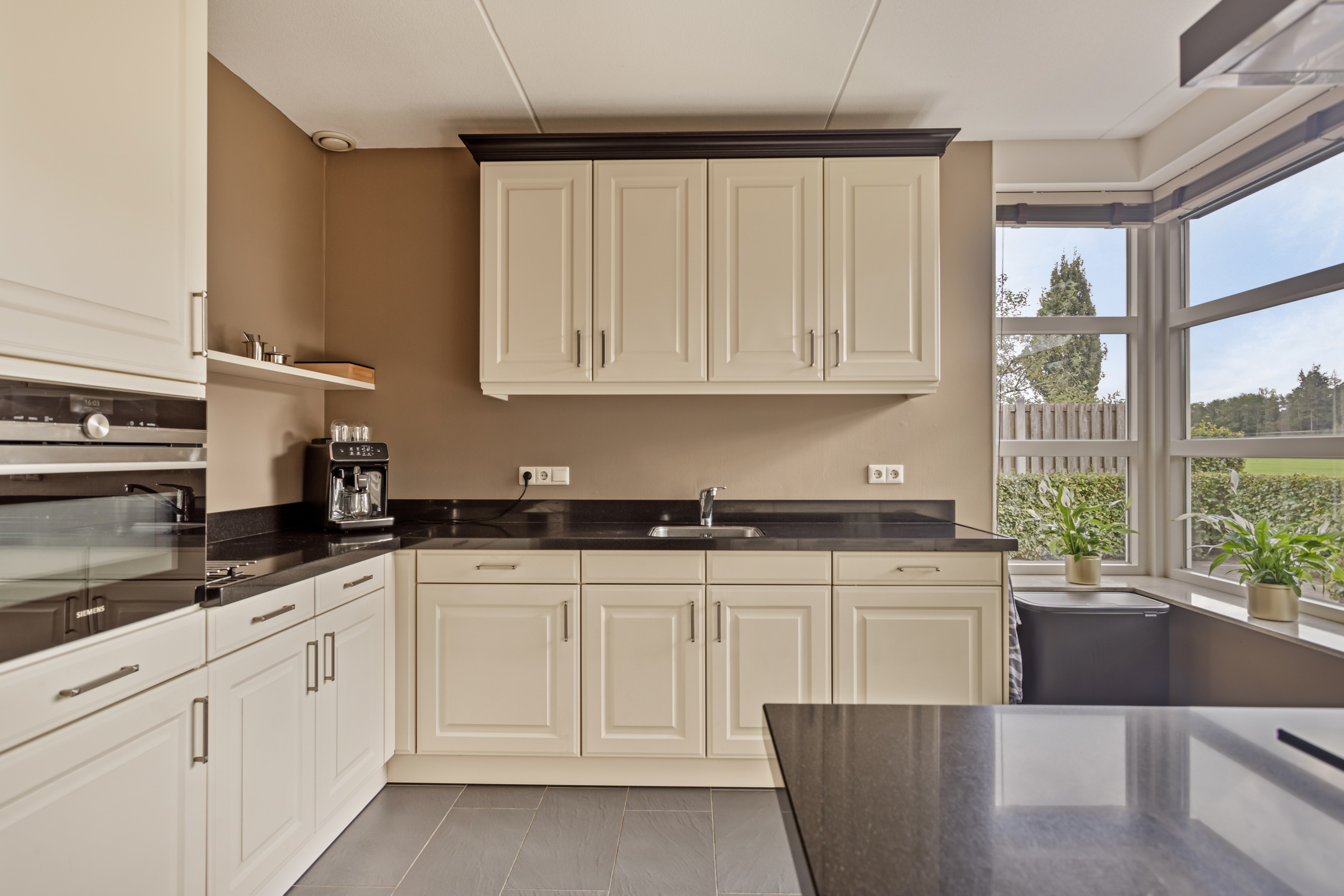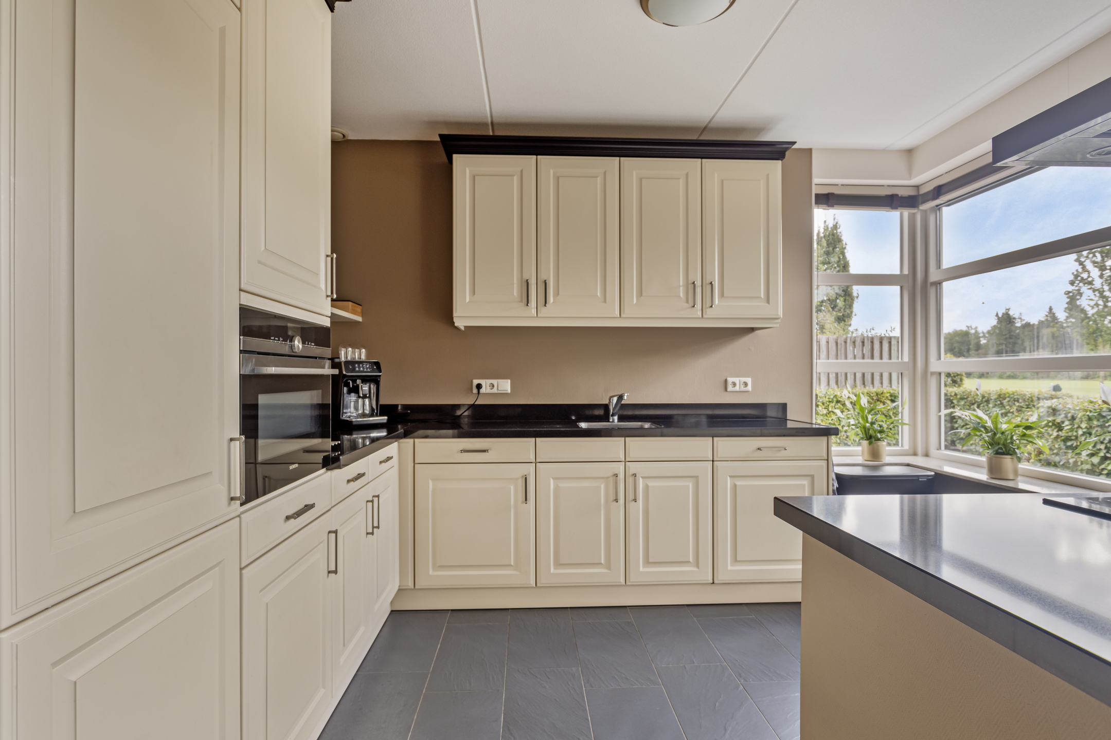 Aan de voorzijde van de woning vind je de ruime woonkeuken, waar plek is voor een grote eettafel. De keuken staat in directe verbinding met het centraal geplaatste kookeiland en is uitgerust met inbouwapparatuur, waaronder een inductiekookplaat, afzuigkap, vaatwasser, koelkast en oven. De gehele begane grond is voorzien van comfortabele vloerverwarming.
