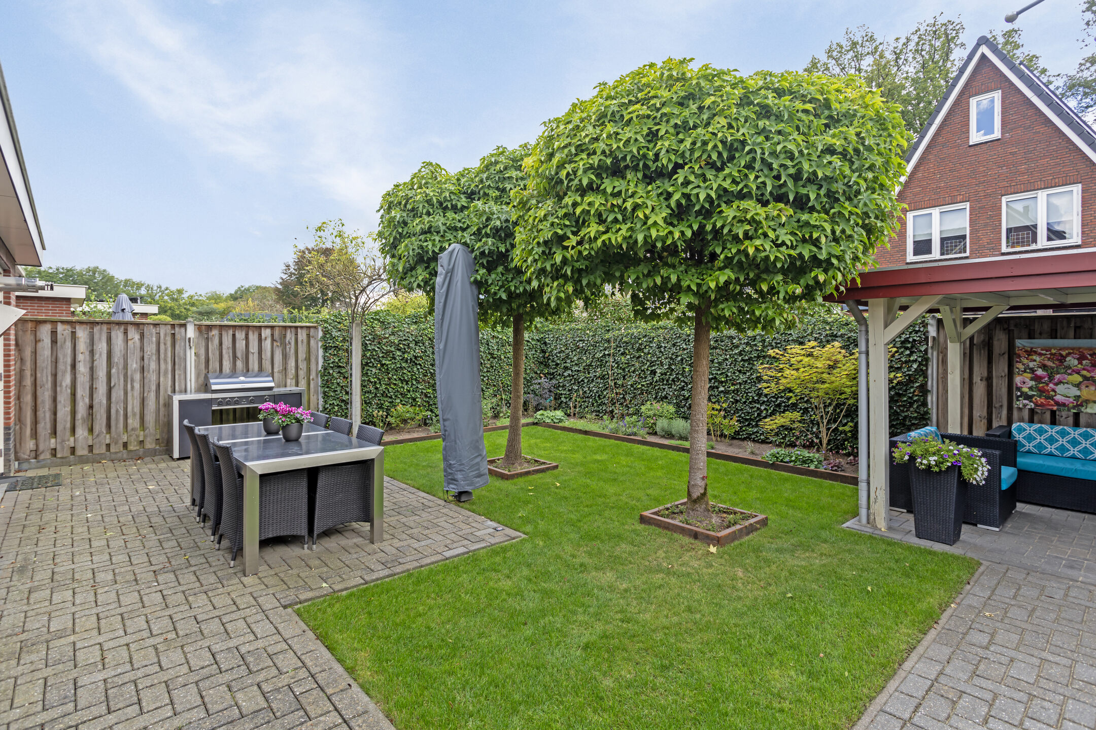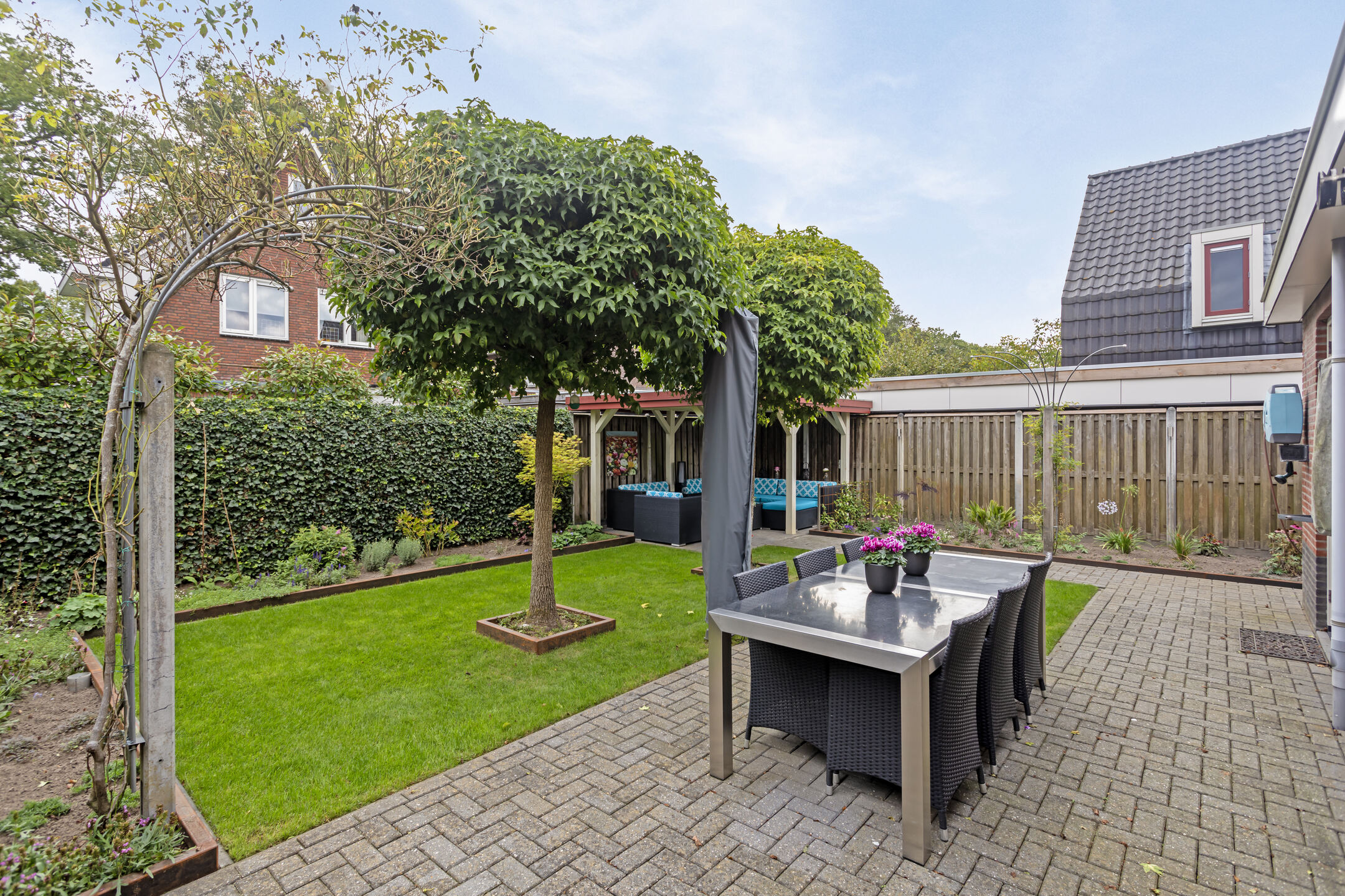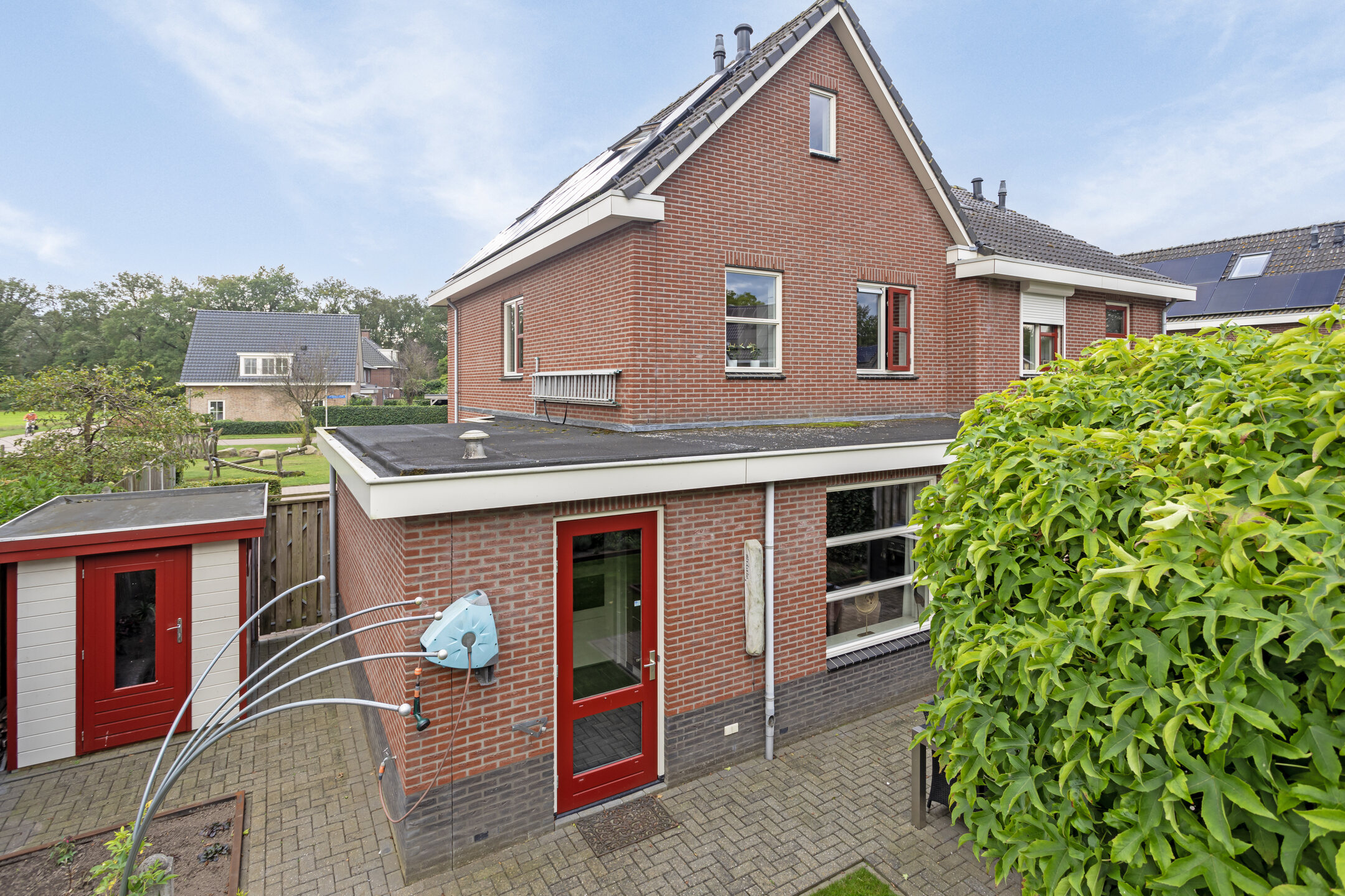 Openslaande deuren geven direct toegang tot de keurig aangelegde achtertuin. De heerlijke veranda voelt als een tweede woonkamer en laat je tot in de late uren genieten van het buiten zijn. De extra houten berging geeft je naast de garage net even die extra bergruimte die je soms nodig bent. Aan de voorzijde is er parkeergelegenheid voor meerdere auto’s op eigen terrein.