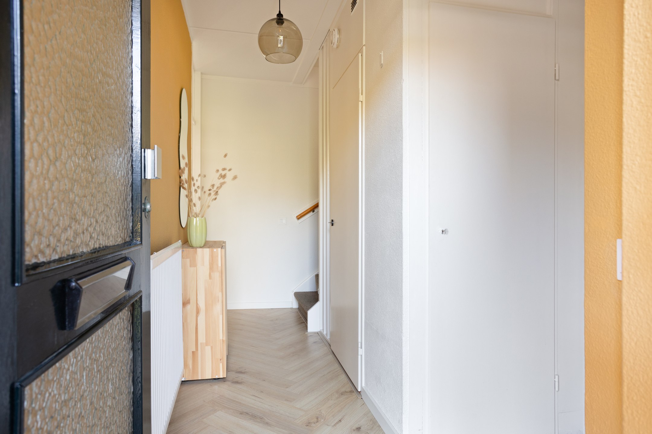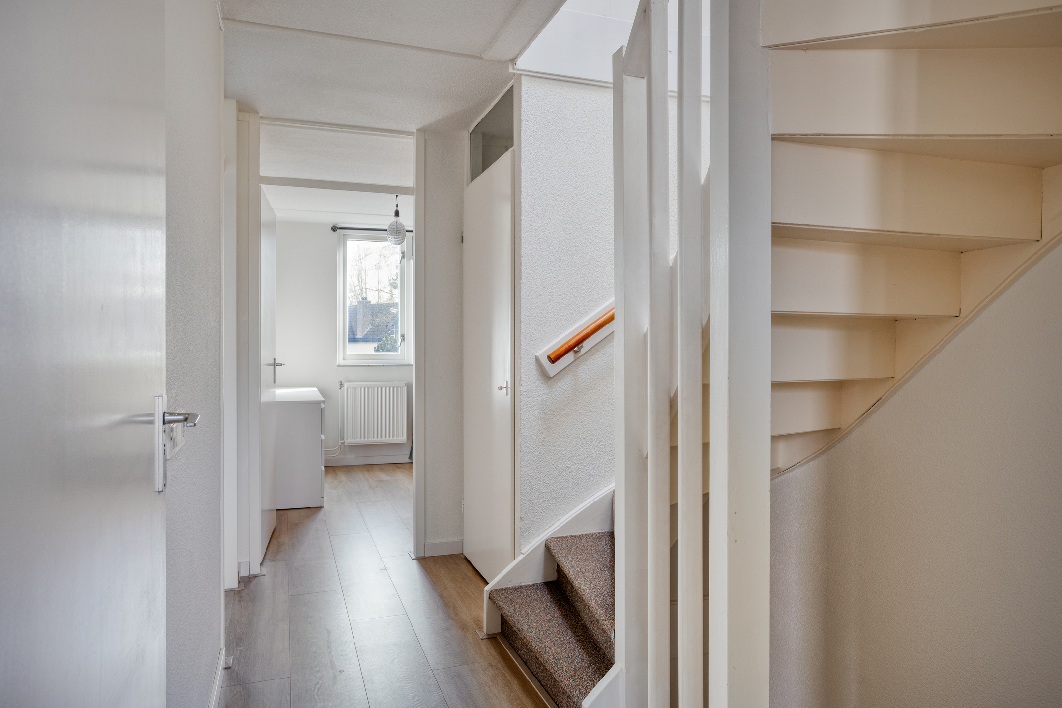 De begane grond is netjes afgewerkt en voorzien van een lichte woonkamer met vloerverwarming, wat zorgt voor extra comfort in het dagelijks gebruik. De open keuken is modern uitgevoerd en sluit goed aan op de leefruimte, waardoor een fijne en praktische woonomgeving ontstaat.